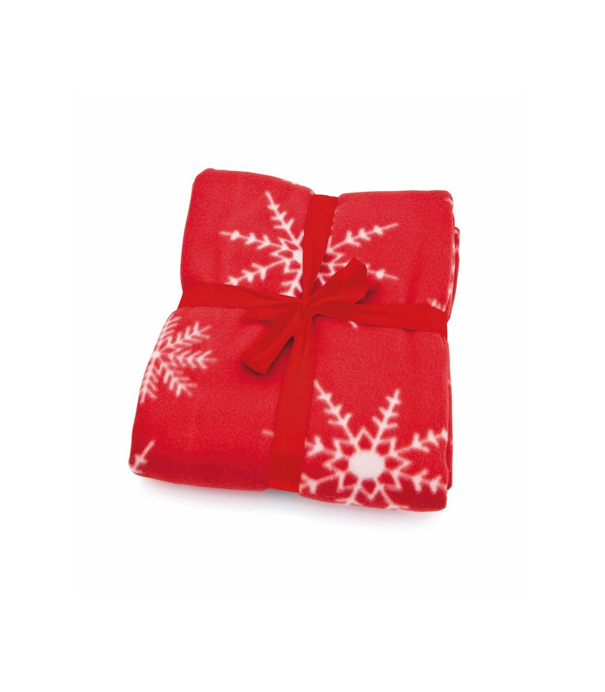 Manta polar de navidad de color rojo con motivos navideños en blanco, fleece de 200g/m2 con tratamiento antipilling para regalos promocionales de empresa.