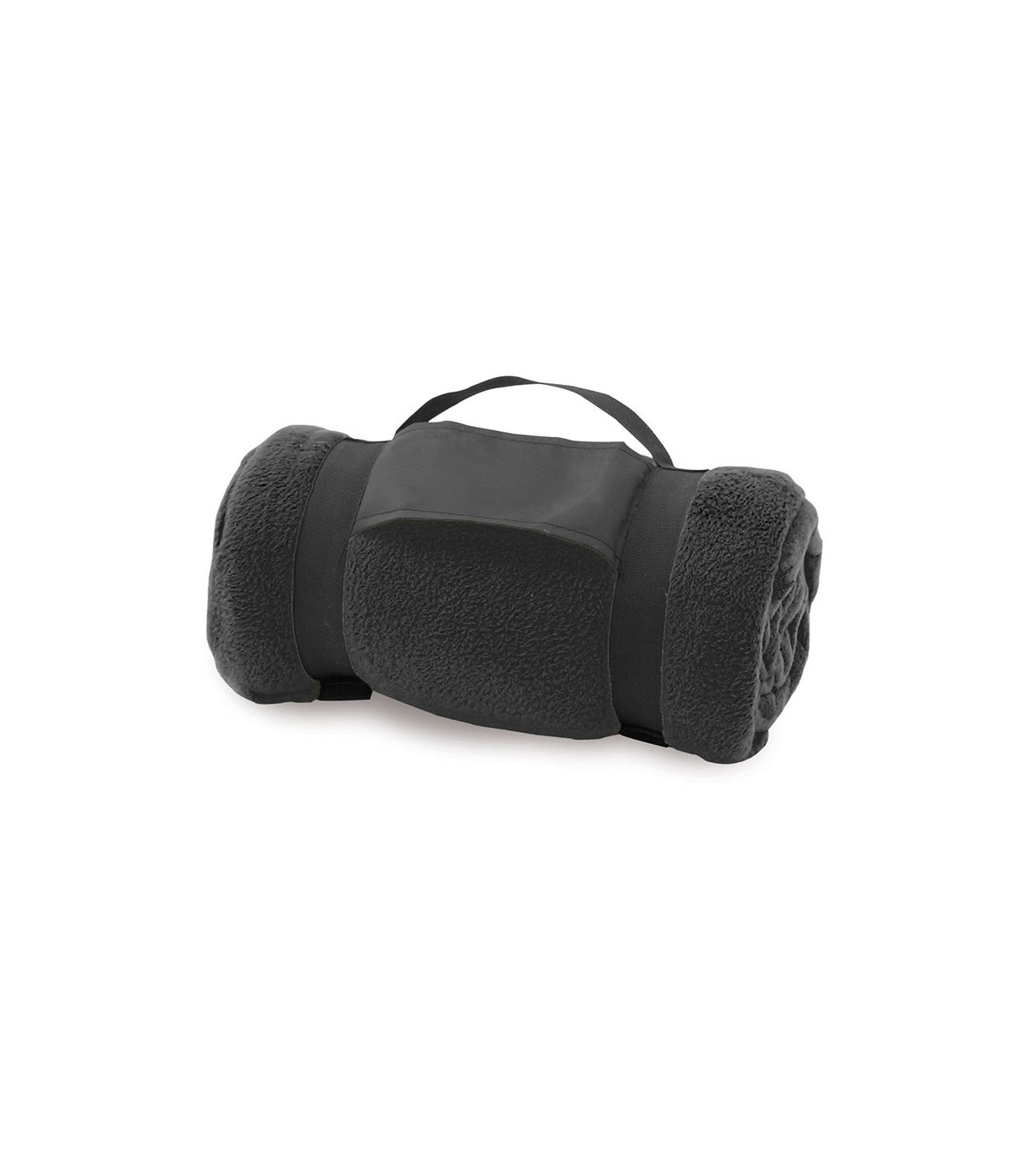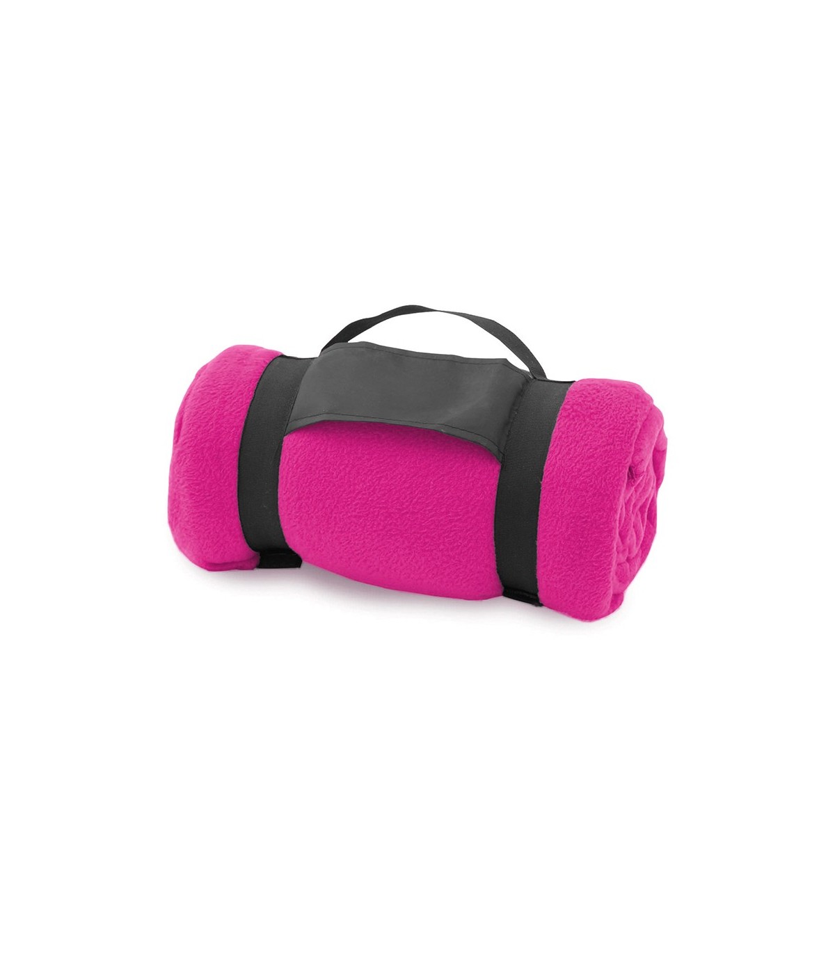 Manta de 130x160 cm en diferentes colores muy llamativos para elegir y personalizar. En material polar fleece anti-pilling de 200g/m2 y con asa de transporte de cierre de velcro en suave poliéster.