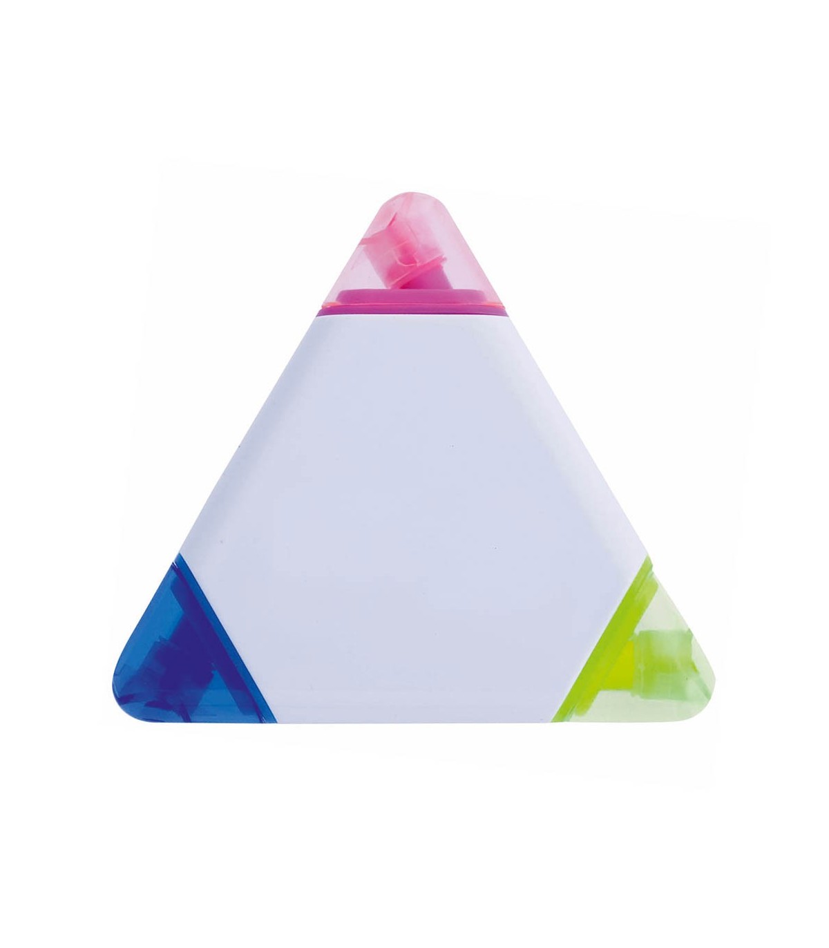 Original marcador fluorescente de tres colores con cuerpo triangular en suave acabado brillante de color blanco, especialmente diseñado para marcaje digital a todo color. Con capuchas translúcidas juego con marcador.