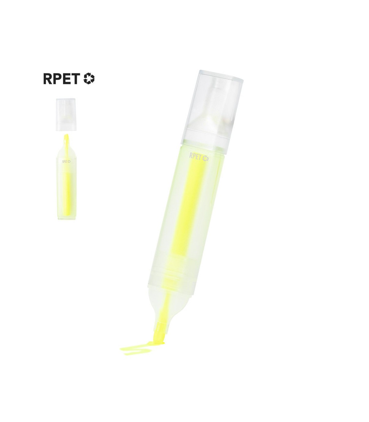 Marcador fluorescente de fabricación ecológica elaborado en RPET, elaborado a partir de plástico reciclado para así fomentar la reutilización de residuos plásticos y ayudar a la sostenibilidad del planeta. Con cuerpo transparente y capucha a juego. Con distintivo RPET impreso en el marcador.