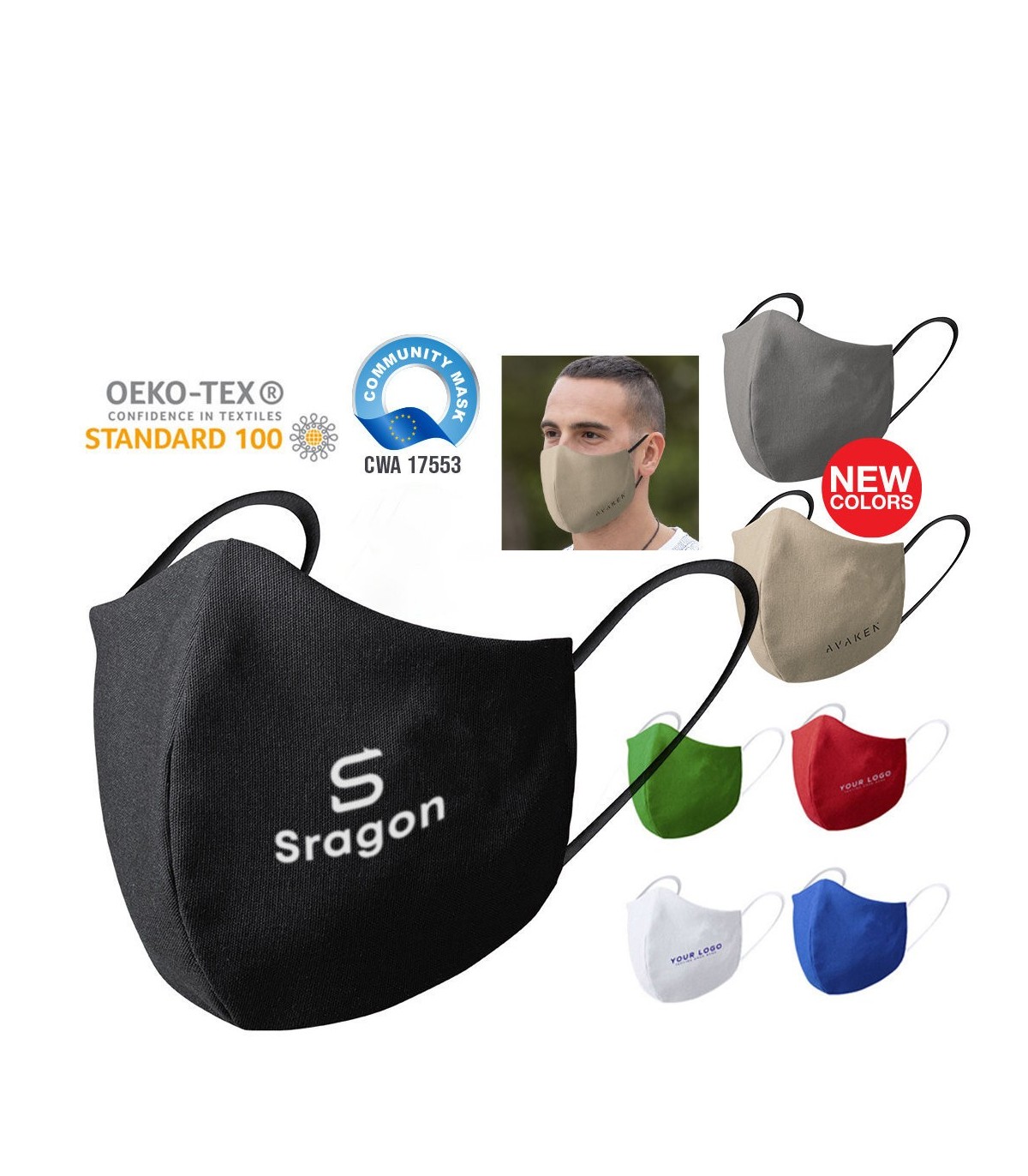 Mascarillas reutilizables marcadas con tu logo para regalos promocionales de empresa, Fabricada en algodón y poliéster de triple capa. Exterior en algodón/poliéster.