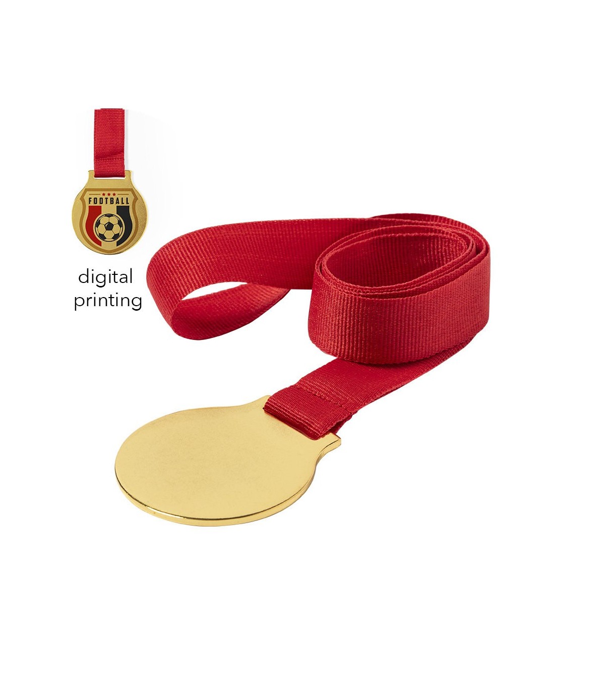 Medalla metálica de acabado dorado liso, con cinta de poliéster en rojo y especialmente diseñada para marcaje en impresión digital.