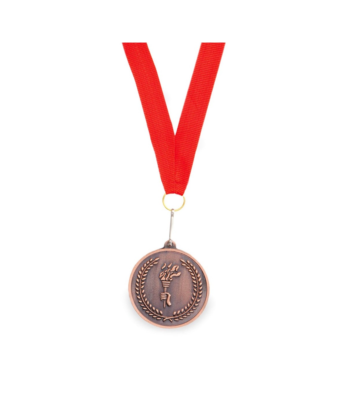 Medallas oro, plata y bronce, metálicas con cinta de poliéster con la bandera española o cinta roja, con cierre mosquetón, marcadas para regalos de empresa.