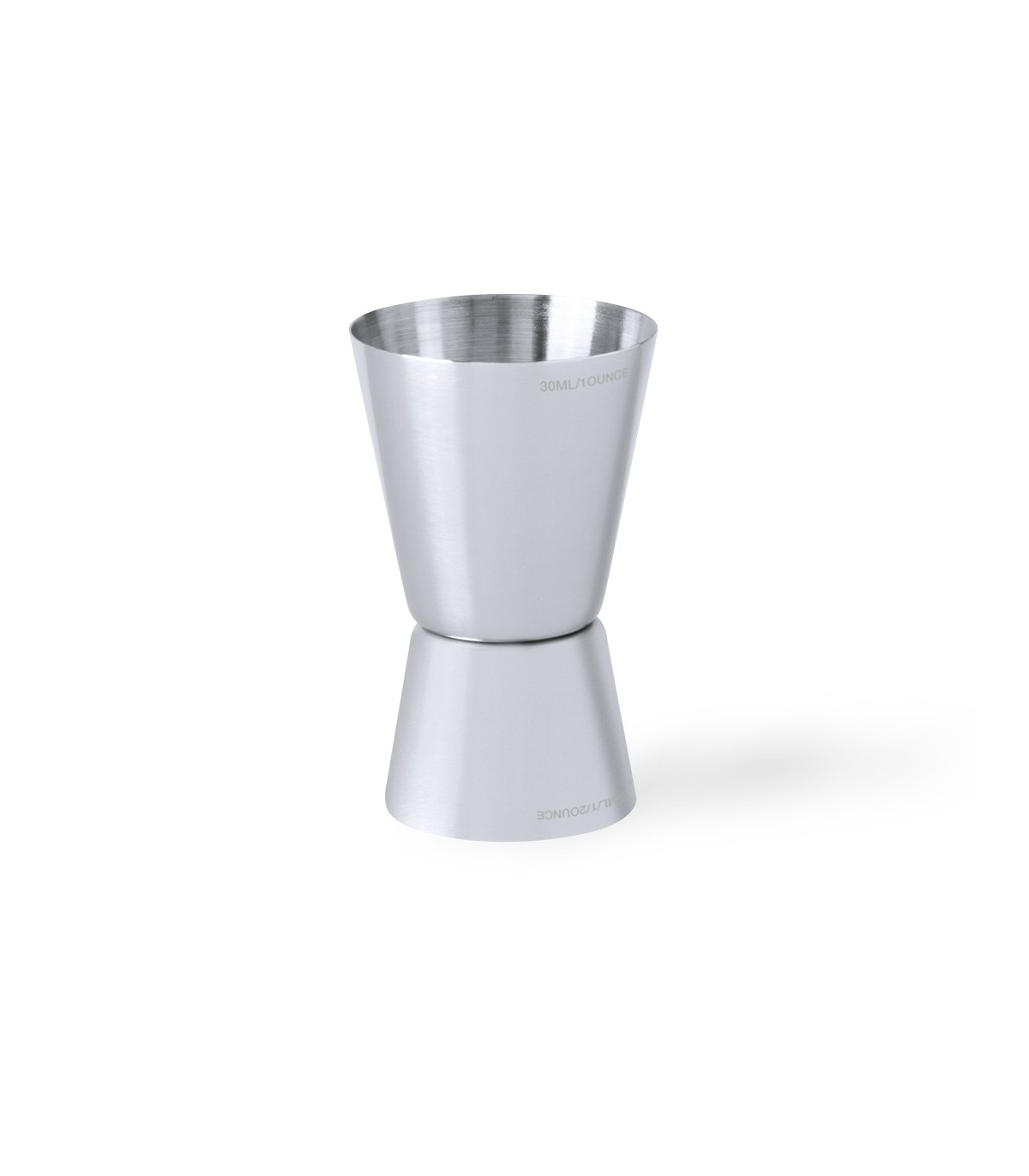 Medidor de bebidas en acero inox de acabado mate. Diseñado especialmente para marcaje en láser y presentado en caja de PVC.