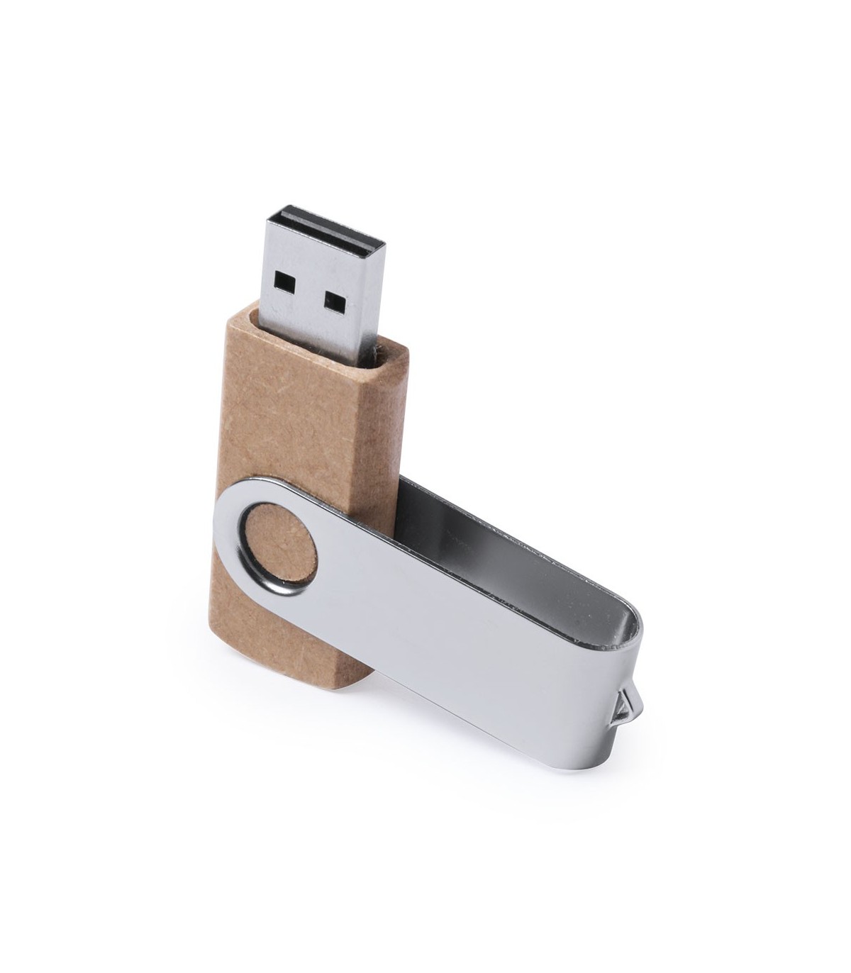 Memoria USB nature de 16GB de capacidad, con mecanismo giratorio, cuerpo acabado en cartón reciclado y clip metálico. Presentada en estuche individual de cartón reciclado.