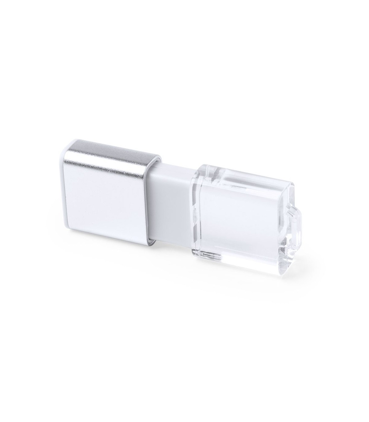 Memoria USB de 16GB de capacidad. De innovador mitad aluminio y mitad acrílico, con luz led interior blanca que ilumina al logotipo. De mecanismo retráctil.