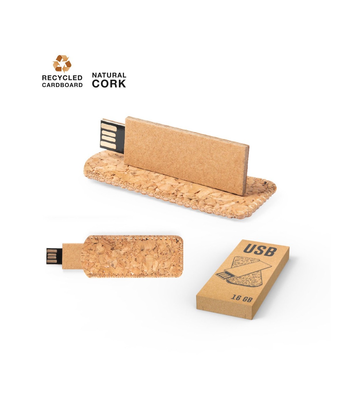 Memoria USB de 16GB de capacidad en línea nature. Cuerpo en cartón reciclado, presentada en una funda de corcho natural y en estuche individual de diseño eco.