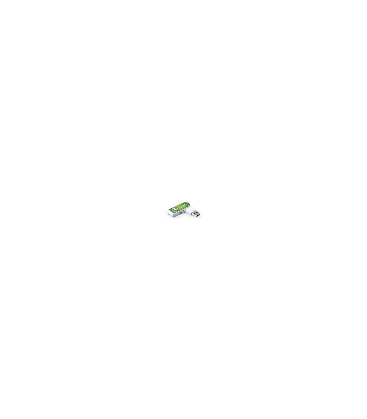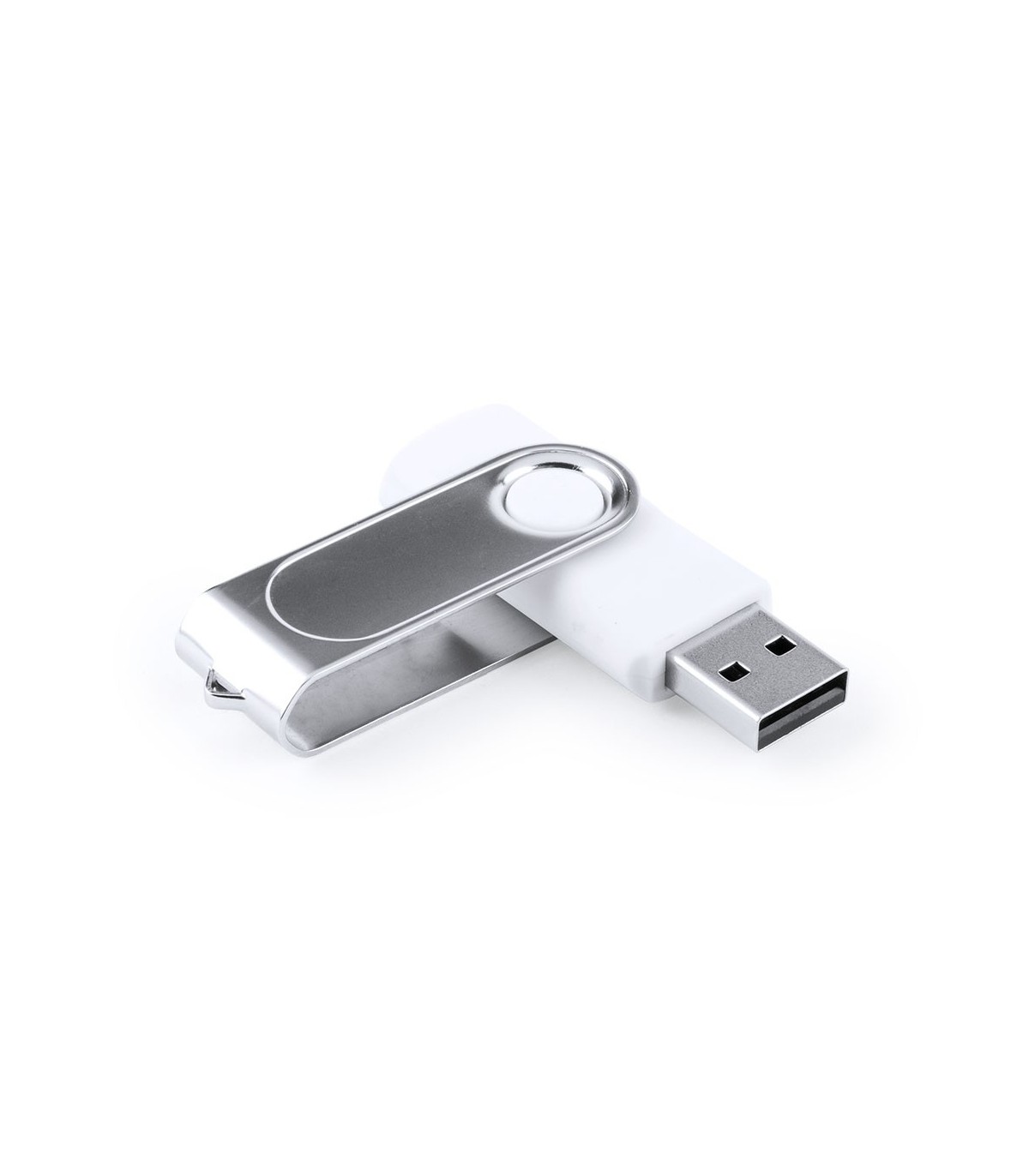 Memoria USB de 16GB de capacidad, mecanismo giratorio y en elegante acabado de color blanco. Con cuerpo troquelado, diseñado para marcaje en doming/gota de resina.