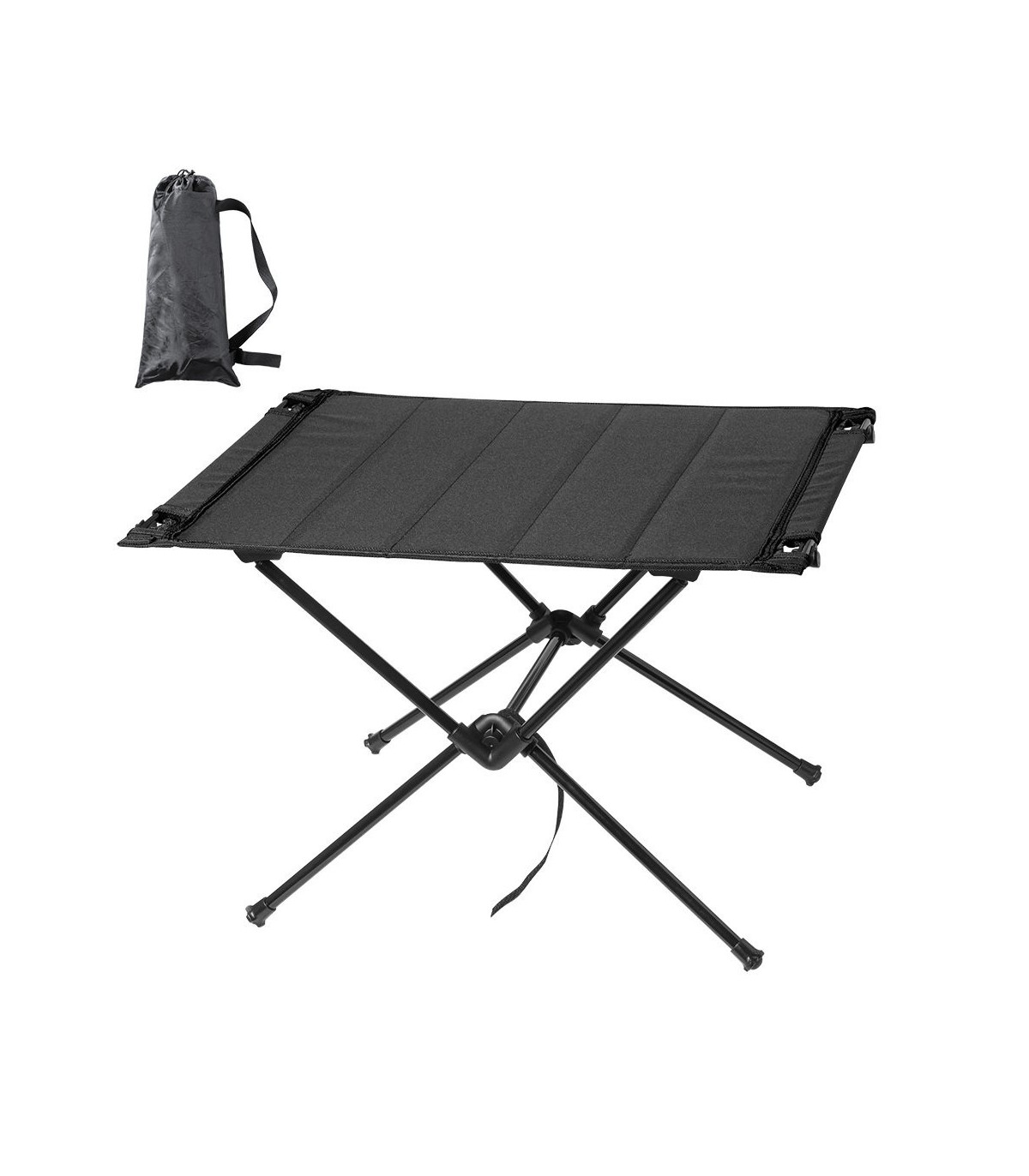 Mesa plegable con resistente cuerpo de metal tubular y superficie en resistente poliéster 600D. Con costuras reforzadas y refuerzos antideslizantes en las patas. De fácil plegado y tamaño compacto, presentada en funda individual.