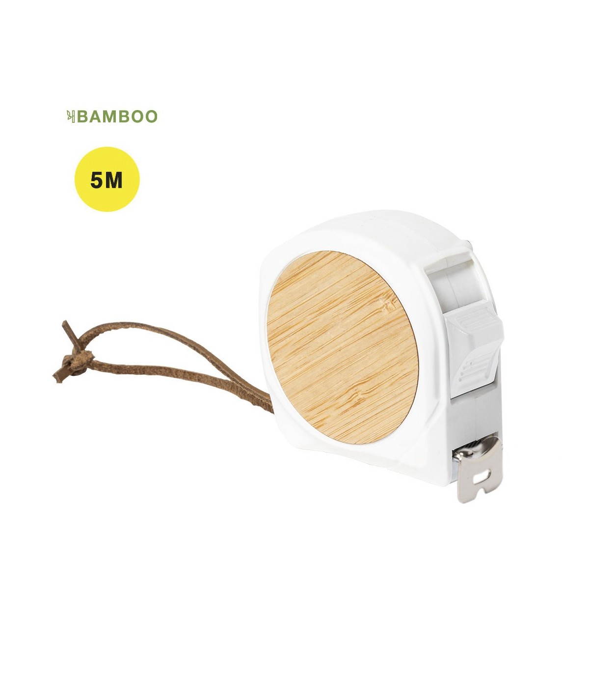 Flexómetro de 5 metros de fabricación ecológica, hecho en combinación de bambú y ABS con tacto goma. Hoja metálica con freno, clip metálico para cinturón y cinta de transporte en PU. Con amplia superficie de marcaje y presentado en atractiva caja de diseño eco