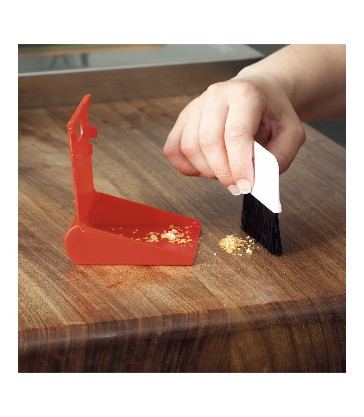 Mini set de limpieza plegable con cepillo y recogedor. Con cuerpo acabado en vivos colores.