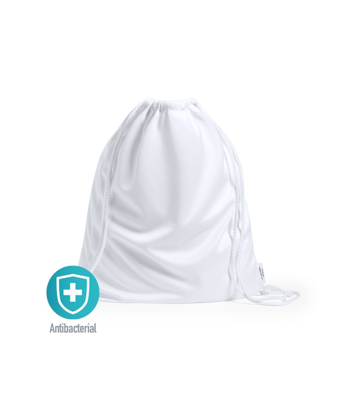 Mochila de cuerdas antibacteriana de alta calidad, en suave poliéster elástico con propiedades hidrófugas, fácil de imprimir. Con etiqueta distintiva antibacteriana. Tamaño 34x42 cm, de acabado cosido y cuerdas gruesas autocierre a juego. Resistencia de hasta 7kg de peso. Los productos con tratamientos antibacterianos son capaces de reducir drásticamente las cargas bacterianas presentes en las superficies de los materiales, gracias a la incorporación de agentes microbianos permanentes estáticos, con alta efectividad para inhibir y prevenir la contaminación bacteriana. Artículo de acuerdo al estándar ISO 20743, que determina la actividad antibacteriana en productos textiles, lo que permite conocer la efectividad de inhibición microbiana que tienen los aditivos sobre los objetos tratados mediante una evaluación cuantitativa.