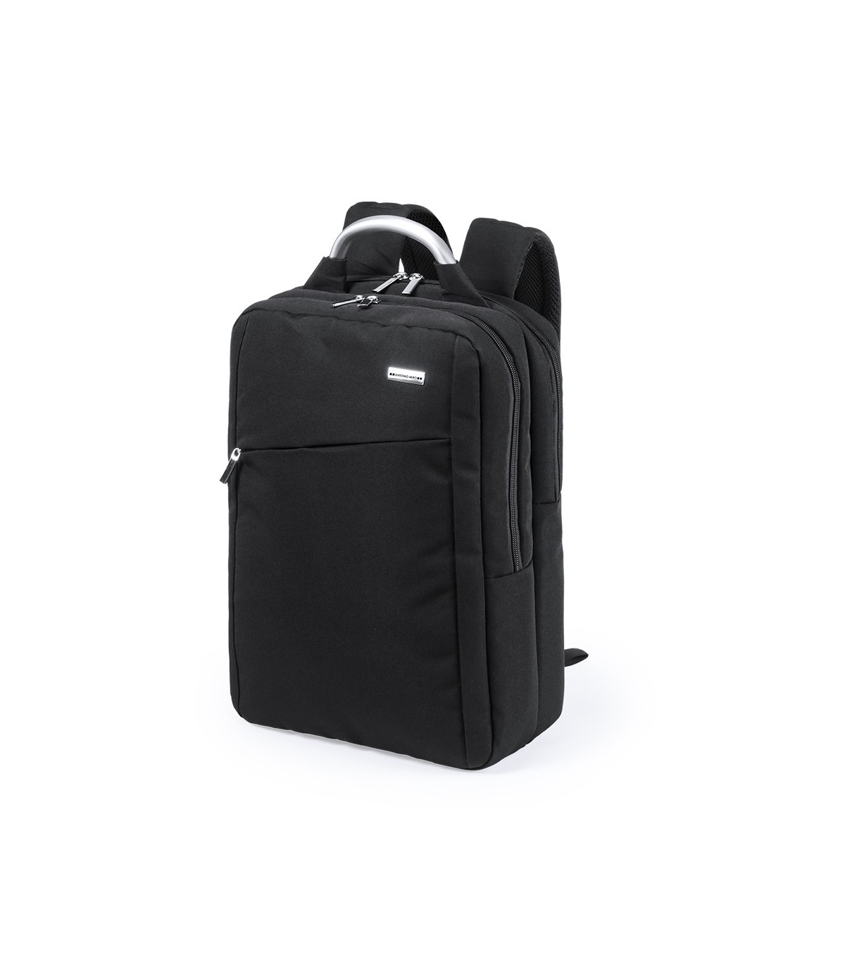 Mochila de Antonio Miró en resistente poliéster 1680D de sobrio diseño en color negro. Con cierre de cremallera, bolsillo frontal y asa reforzada metálica. Con acolchado ergonómico en espalda y cintas de hombros, incluye compartimento interior acolchado para portátil de hasta 15 pulgadas y compartimento para tablet de hasta 12 pulgadas. Fundas interiores para bolígrafos y smartphone. Con logotipo de la marca en frontal.
