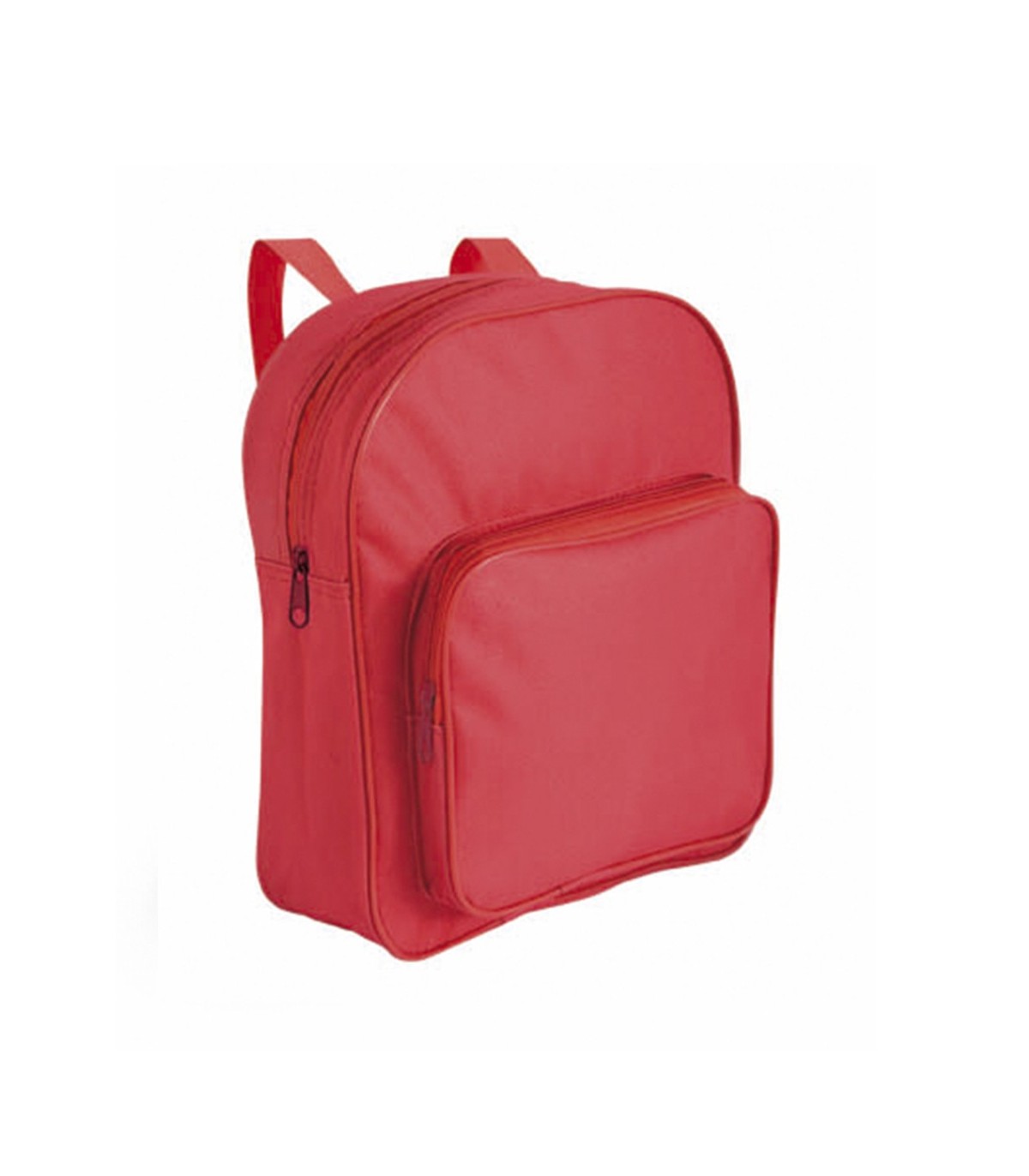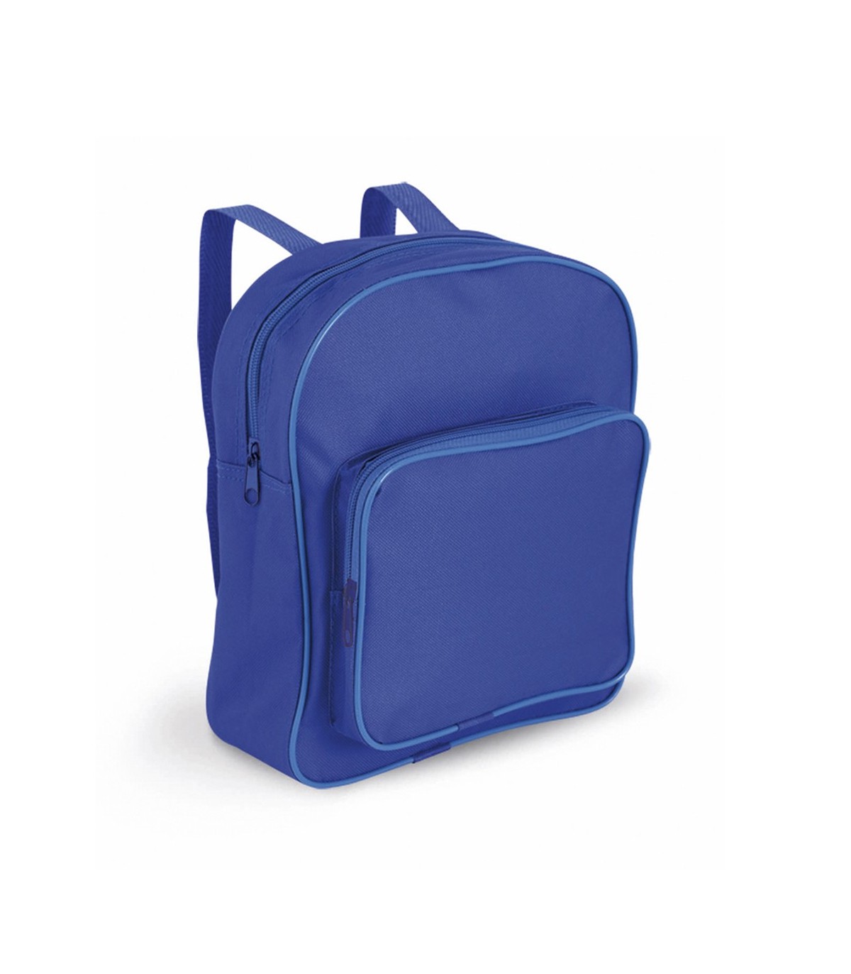 Mochila para niño en resistente poliéster 600D de desenfadado diseño en alegre gama de colores y con ribete de refuerzo a juego. Con cierre de cremallera a juego, bolsillo frontal y esquinas reforzadas. Cintas de hombros ajustables a juego.