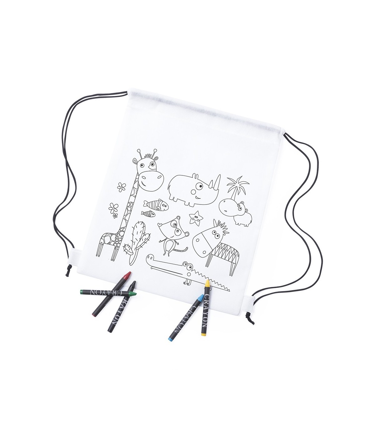 Mochila de non-woven en color blanco especialmente diseñada para colorear con ceras. Incluye 5 ceras de cuerpo cilíndrico en variados colores. Con cuerdas autocierre en color negro y refuerzo en las esquinas.