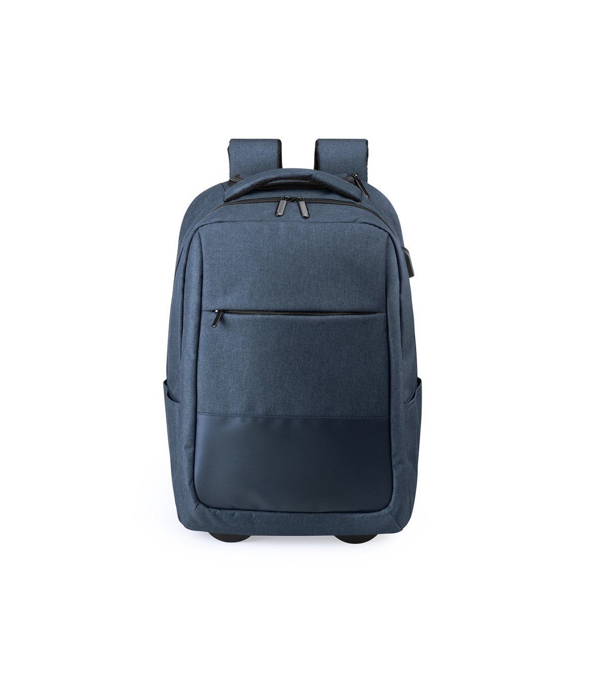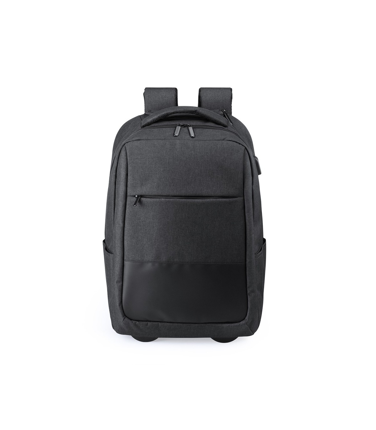 Mochila trolley en resistente poliéster 300D. Con conexión USB -powerbank no incuido- y bolsillo interior acolchado para ordenador portátil de hasta 15 pulgadas y compartimento para tablet de hasta 10 pulgadas. Bolsillo principal con doble tirador, bolsillos lateral y frontal. Compartimento para mecanismo de trolley con cierre de cremallera, asa reforzada y accesorio cubre ruedas con fijación de velcro. Espalda acolchada y cintas de hombros ajustables con acolchado.