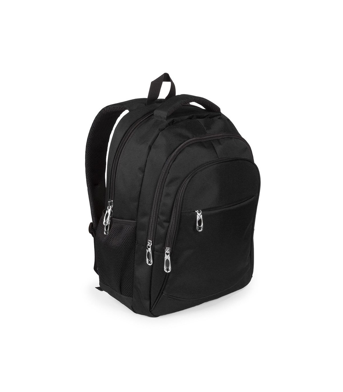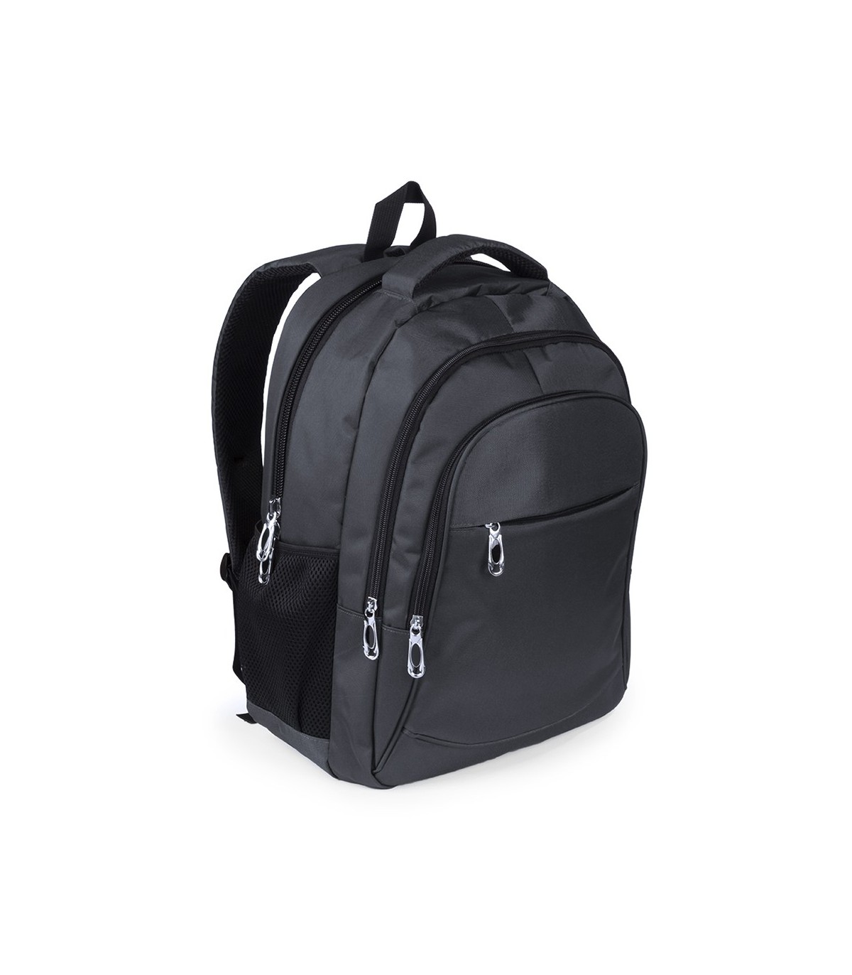 Mochila de resistente nylon 600D de sobrio diseño con cierre de cremallera, bolsillos frontales y asa reforzada doble. Con acolchado ergonómico en espalda y cintas de hombros, incluye compartimento interior acolchado para ordenador portátil de hasta 15 pulgadas.