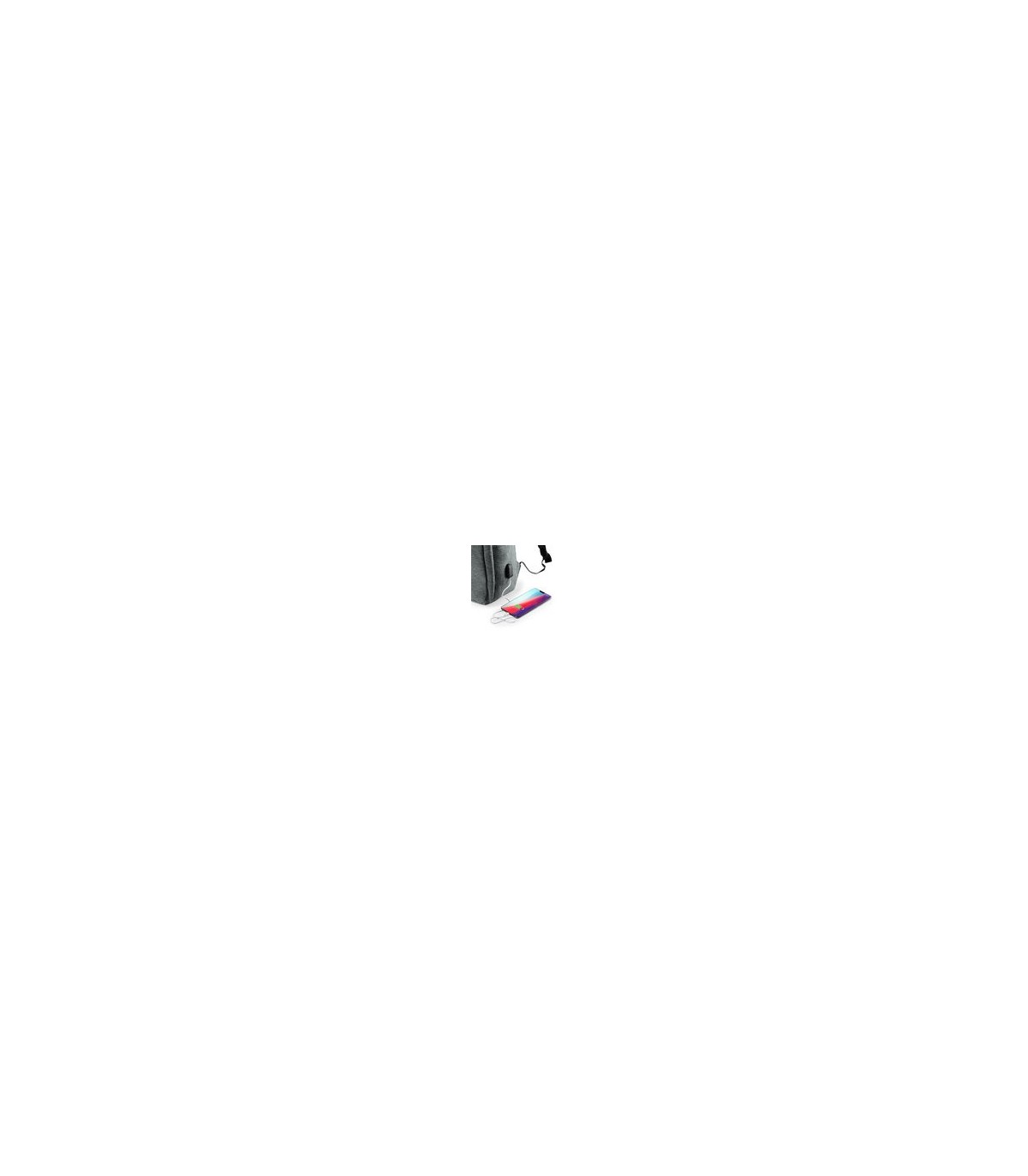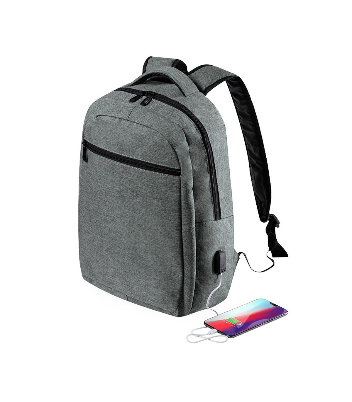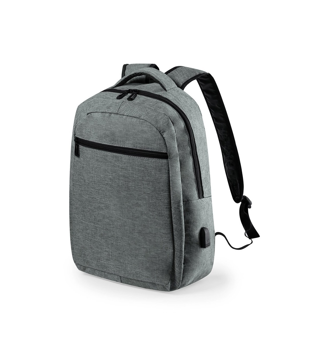 Mochila de negocios en resistente poliéster 600D. Con cierre de cremallera de doble tirador y bolsillo en frontal. Interior con bolsillos acolchados para tablet de hasta 10 pulgadas y ordenador portátil de hasta 15 pulgadas, con estación de carga USB (cable incluido, batería auxiliar no incluida). Bolsillo lateral de redecilla, esquinas reforzadas, asa de transporte acolchada y accesorios en color negro. Espalda y cintas de hombros acolchadas y ajustables.
