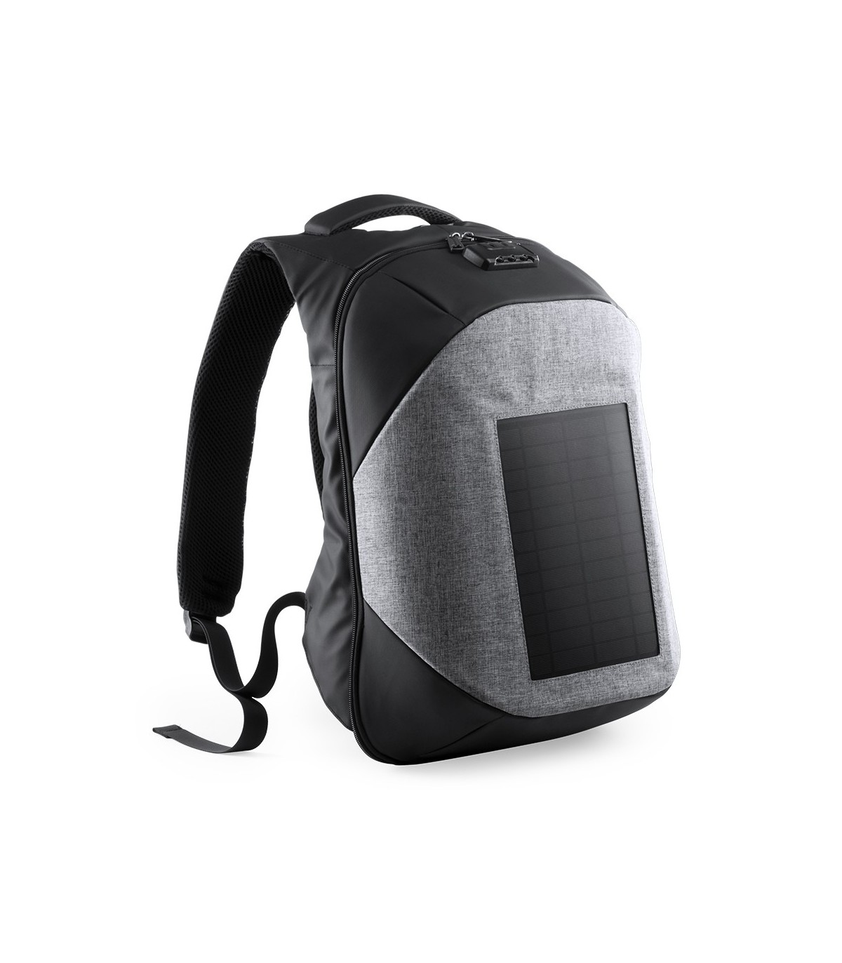 Mochila cargador con panel de carga solar en resistente poliéster 1200D. Resistente al agua, con salida USB para carga -powerbank no incluido- y cierre de seguridad con contraseña. Compartimento principal con doble tirador, con bolsillo acolchado para ordenador portátil de hasta 15 pulgadas y tablet de hasta 10 pulgadas. Cintas de hombros y espalda con acolchado ergonómico.