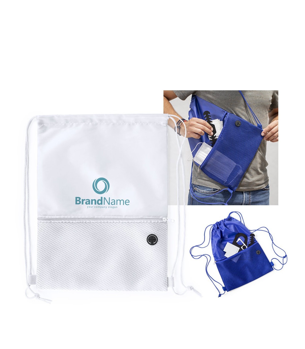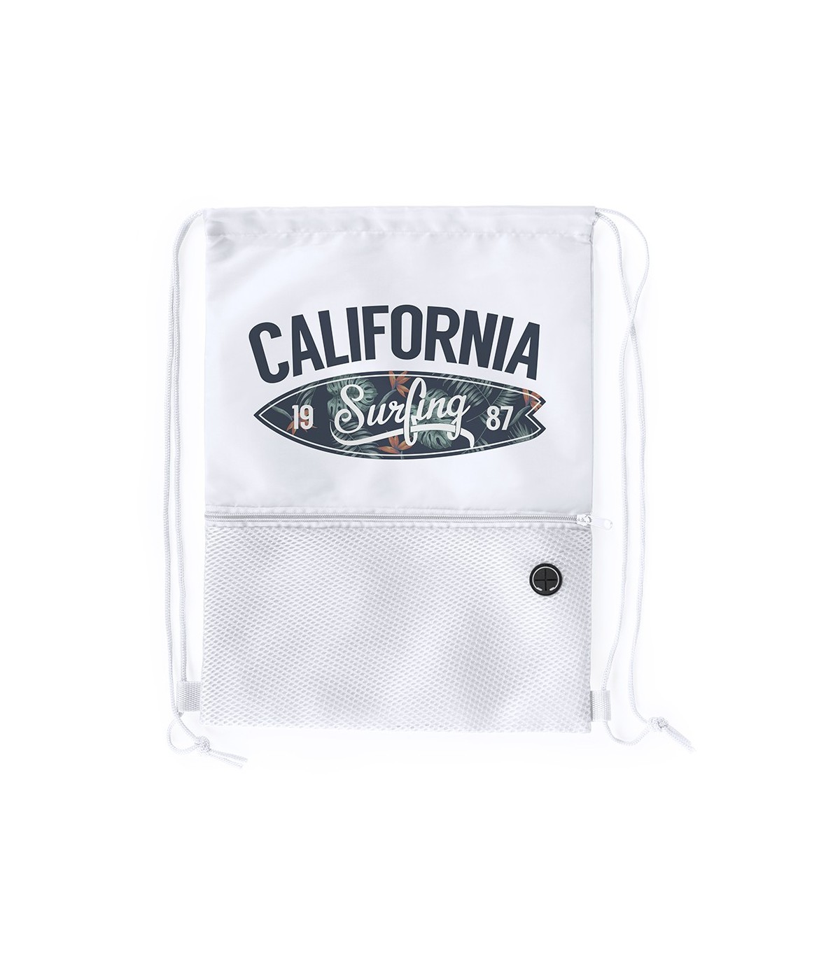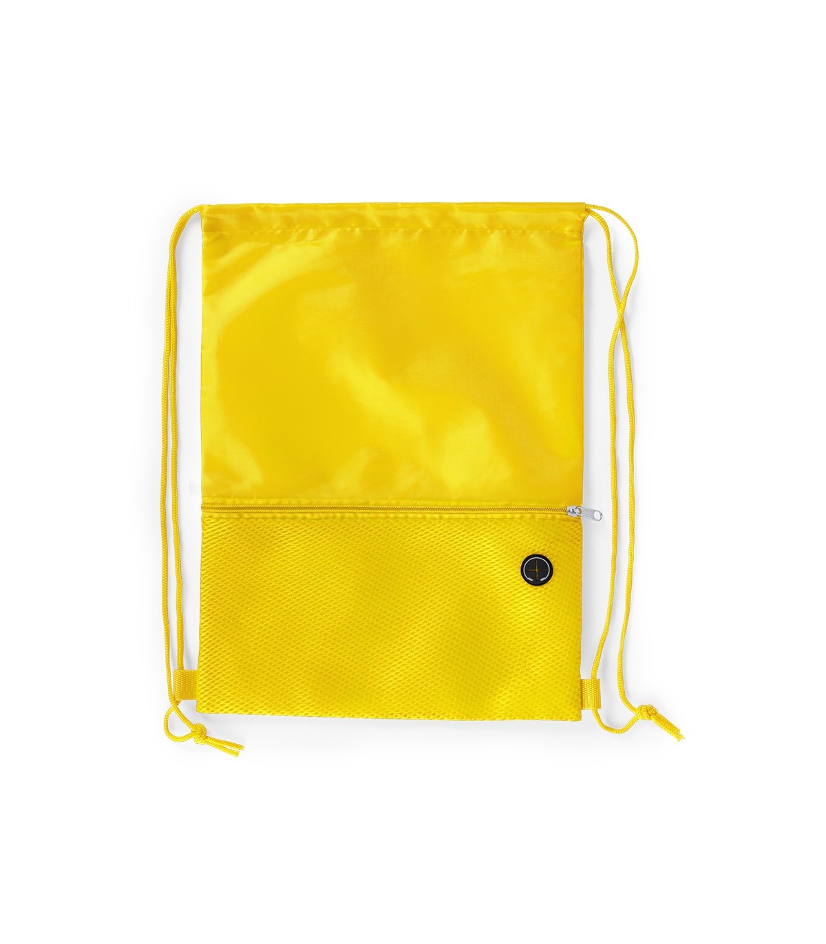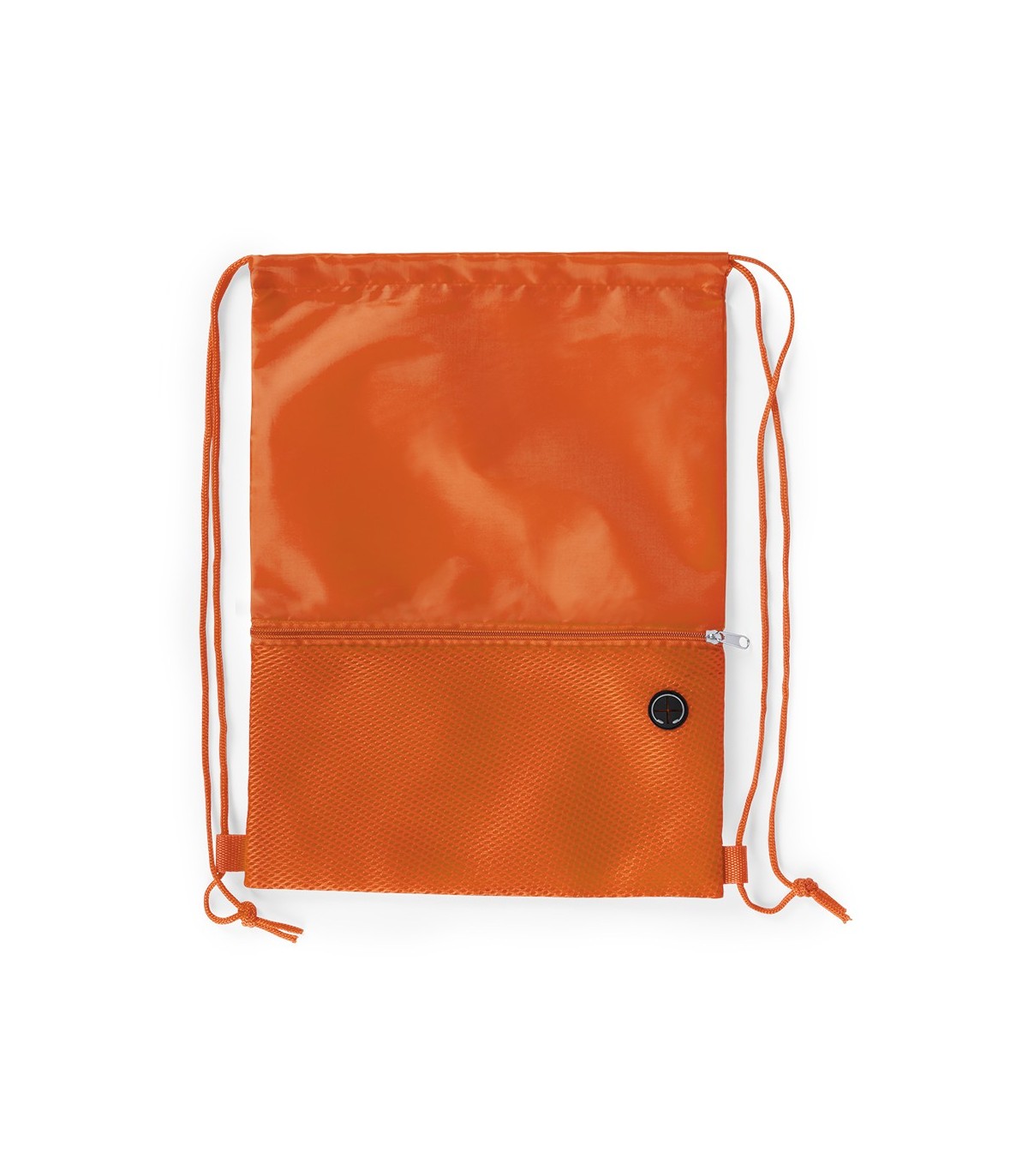Mochila de cuerdas en suave poliéster 210D, Con bolsillo frontal de redecilla con cremallera y salida de auriculares. Cuerdas autocierre a juego y esquinas reforzadas.