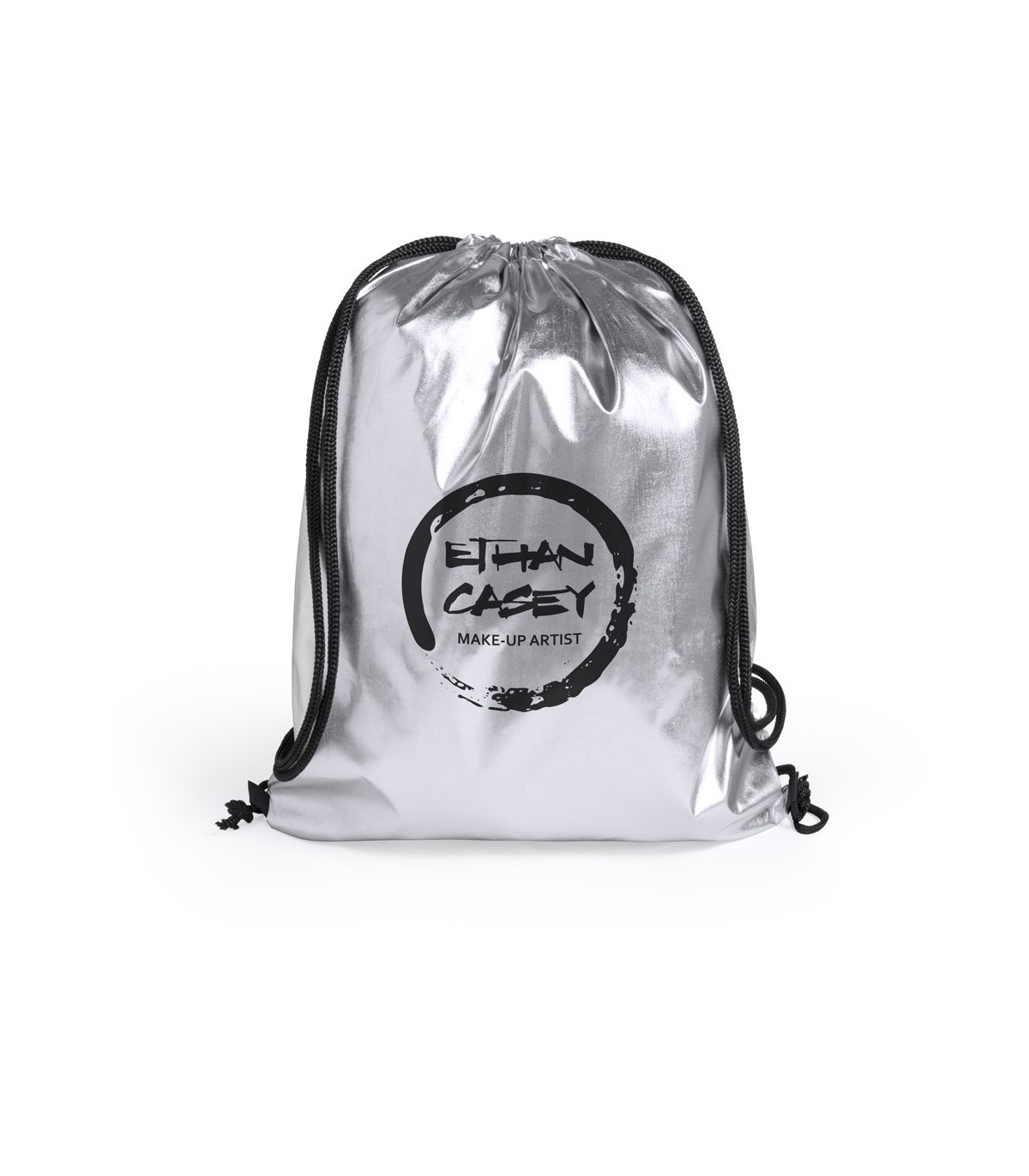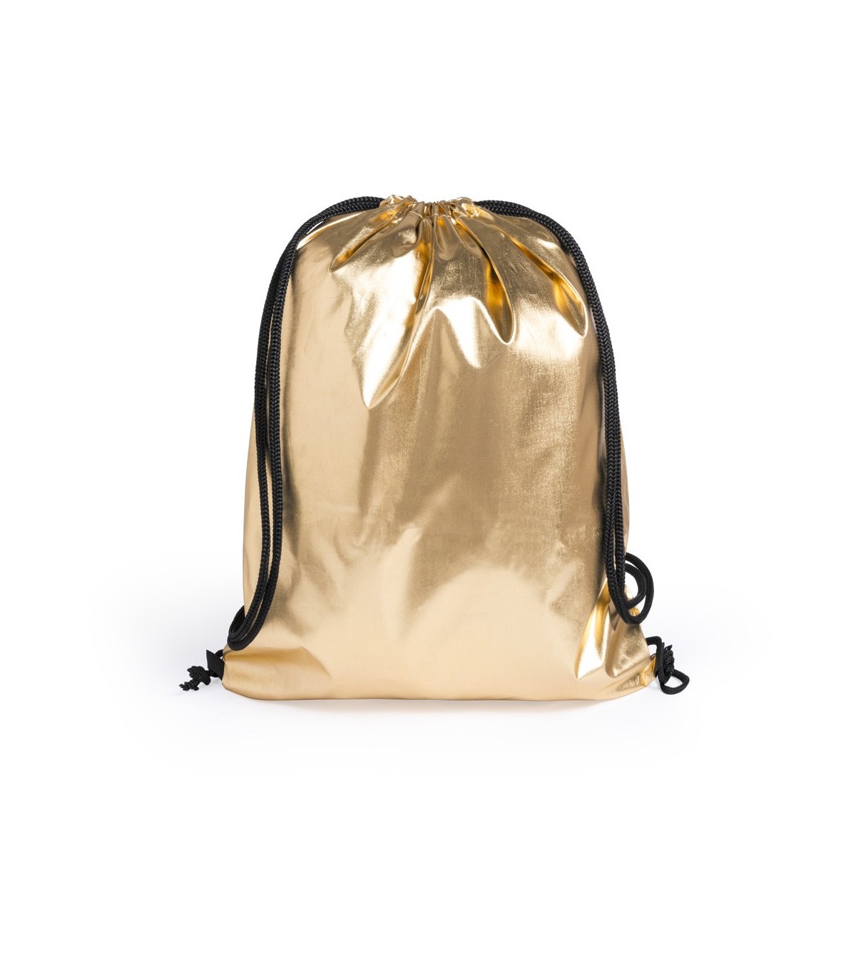 Mochila de cuerdas en suave poliéster 210T de brillantes colores plateado y dorado. Con cuerdas auto cierre gruesas en negro y esquinas reforzadas.