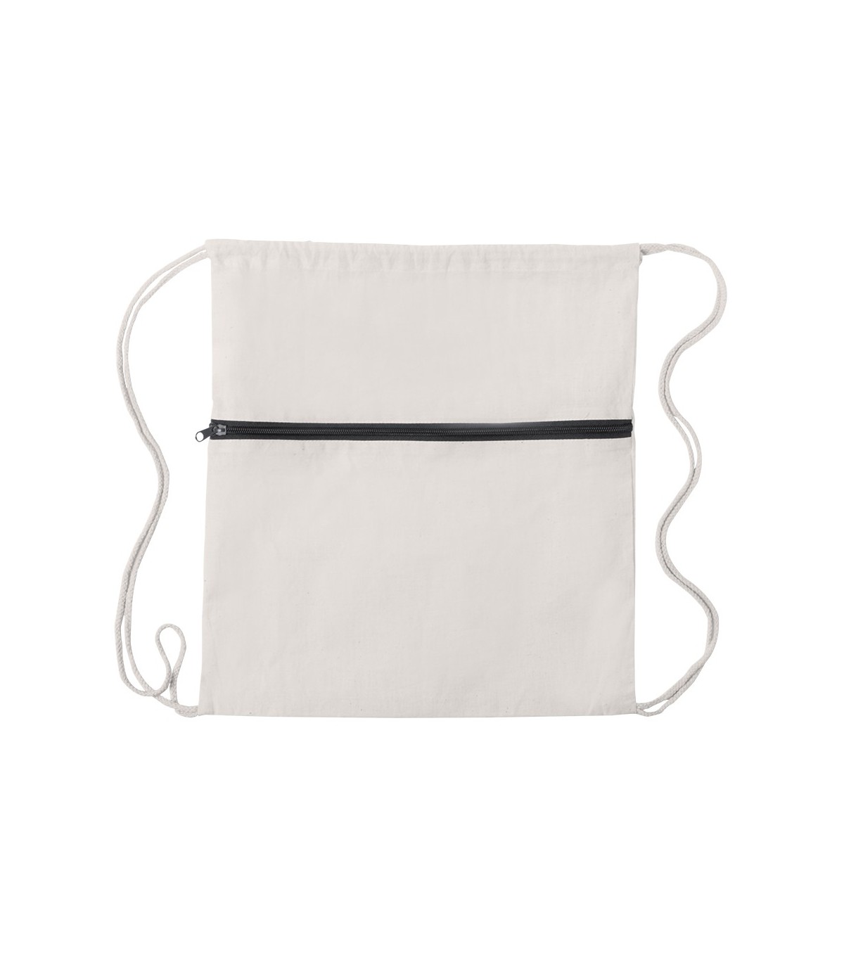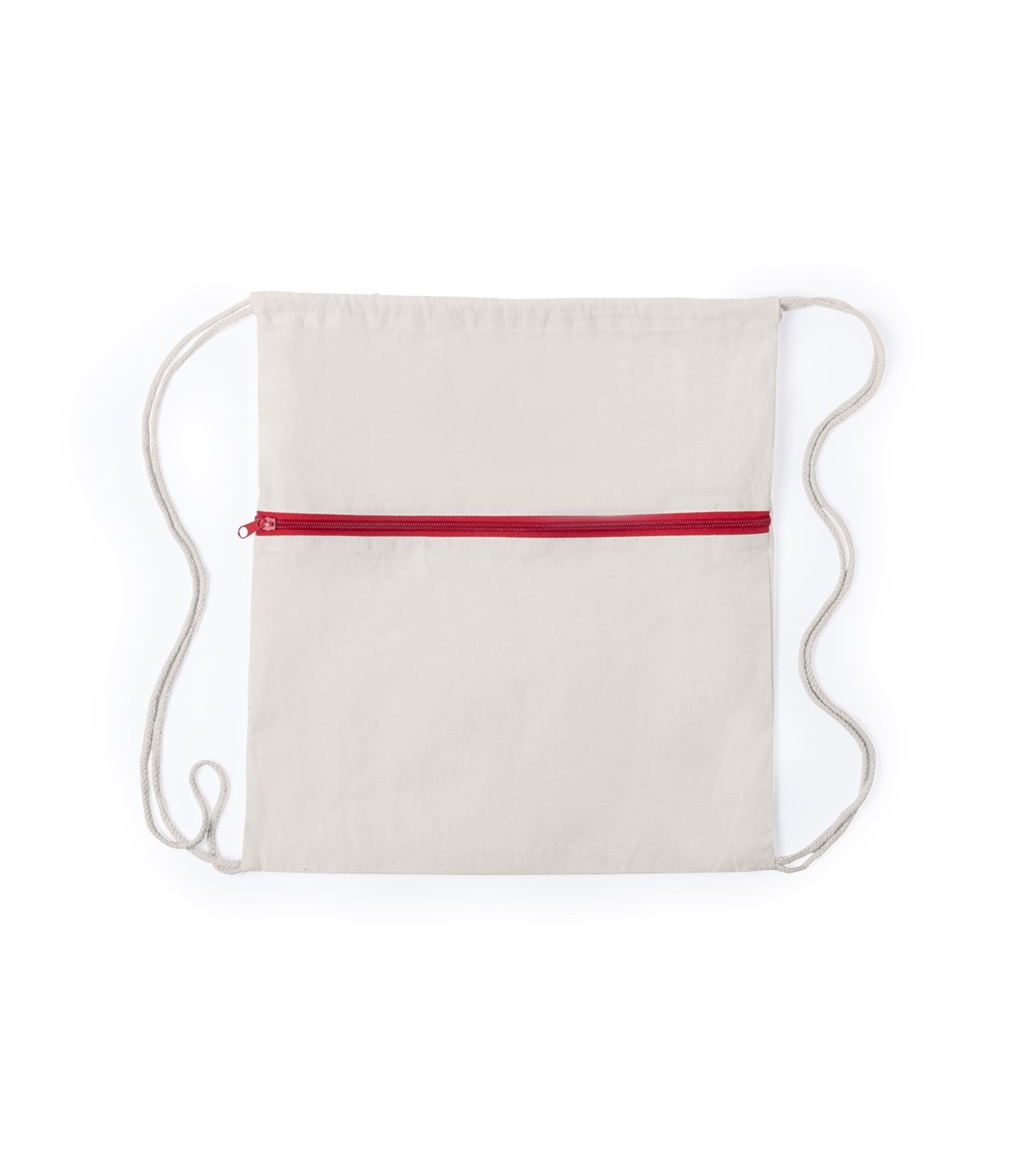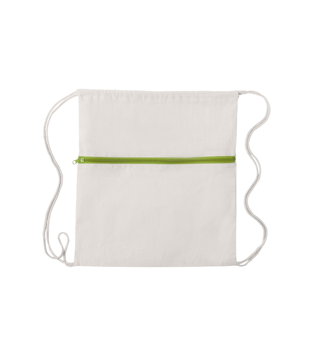 Mochila de cuerdas en tejido 100% algodón de suave acabado. Con bolsillo frontal de cremallera en variada gama de vivos colores y cuerdas autocierre a juego con refuerzo en las esquinas.