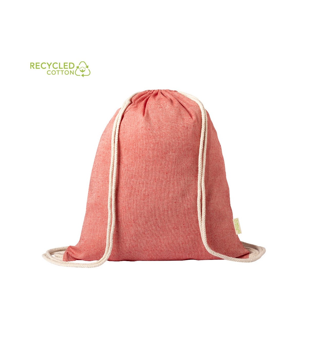 Mochila de cuerdas publicitarias de 100% algodón reciclado de 120 g/m². Cuerdas autocierre en algodón, con distintivo eco en etiqueta lateral.