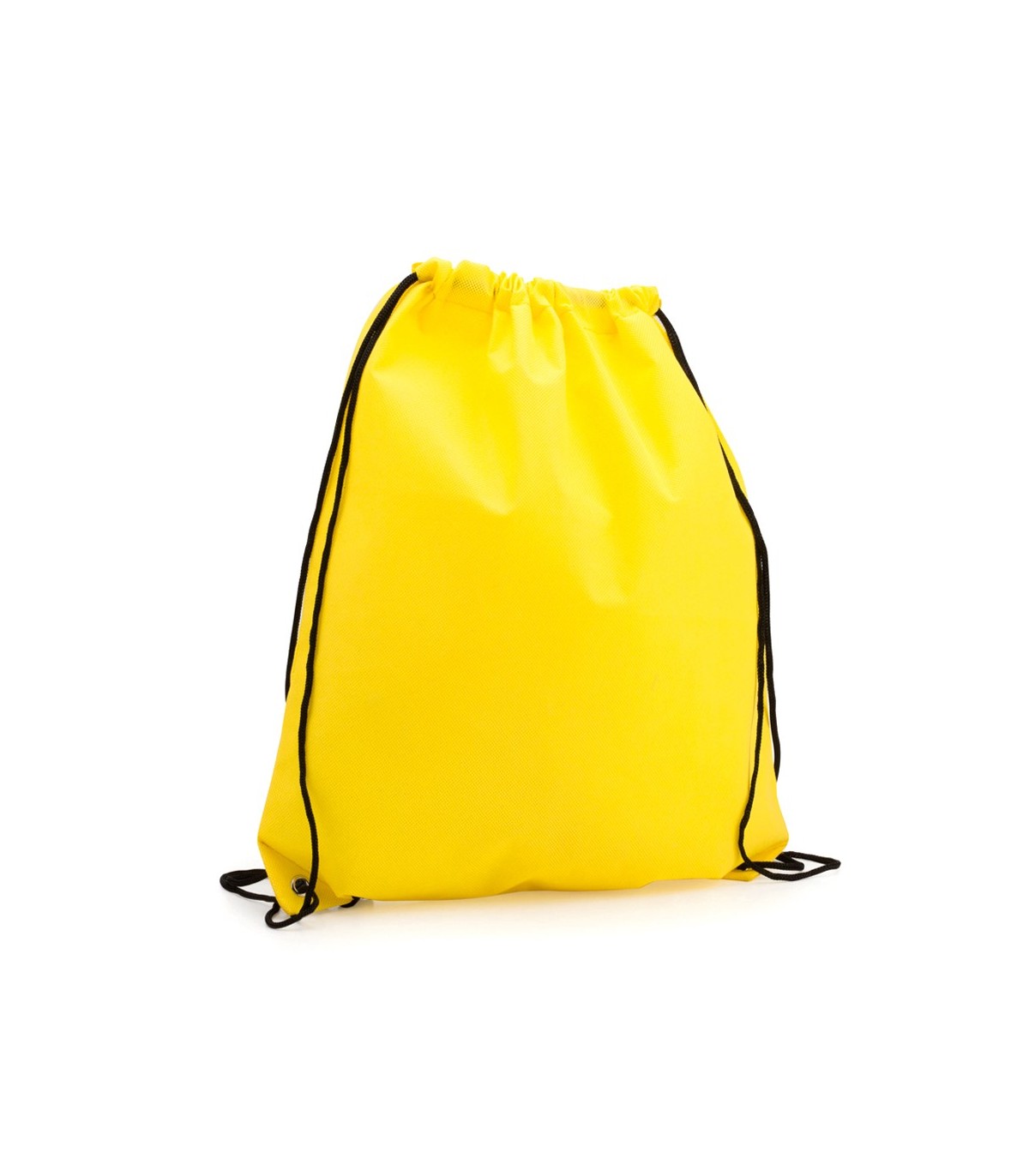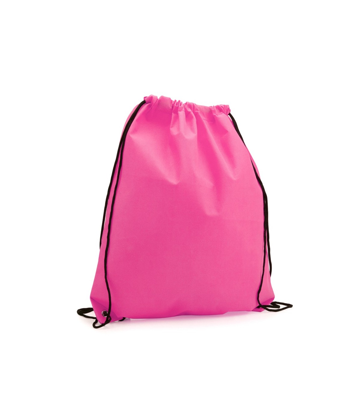 Mochila de cuerdas en suave non-woven de alegres colores y extensa gama de colores. Con cuerdas autocierre en color negro y esquinas reforzadas con argollas metálicas.