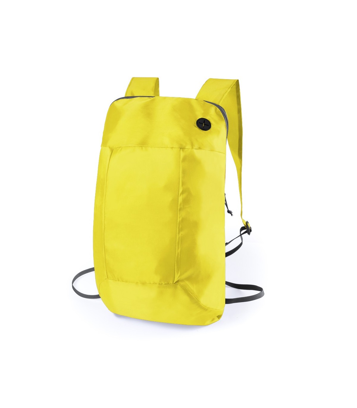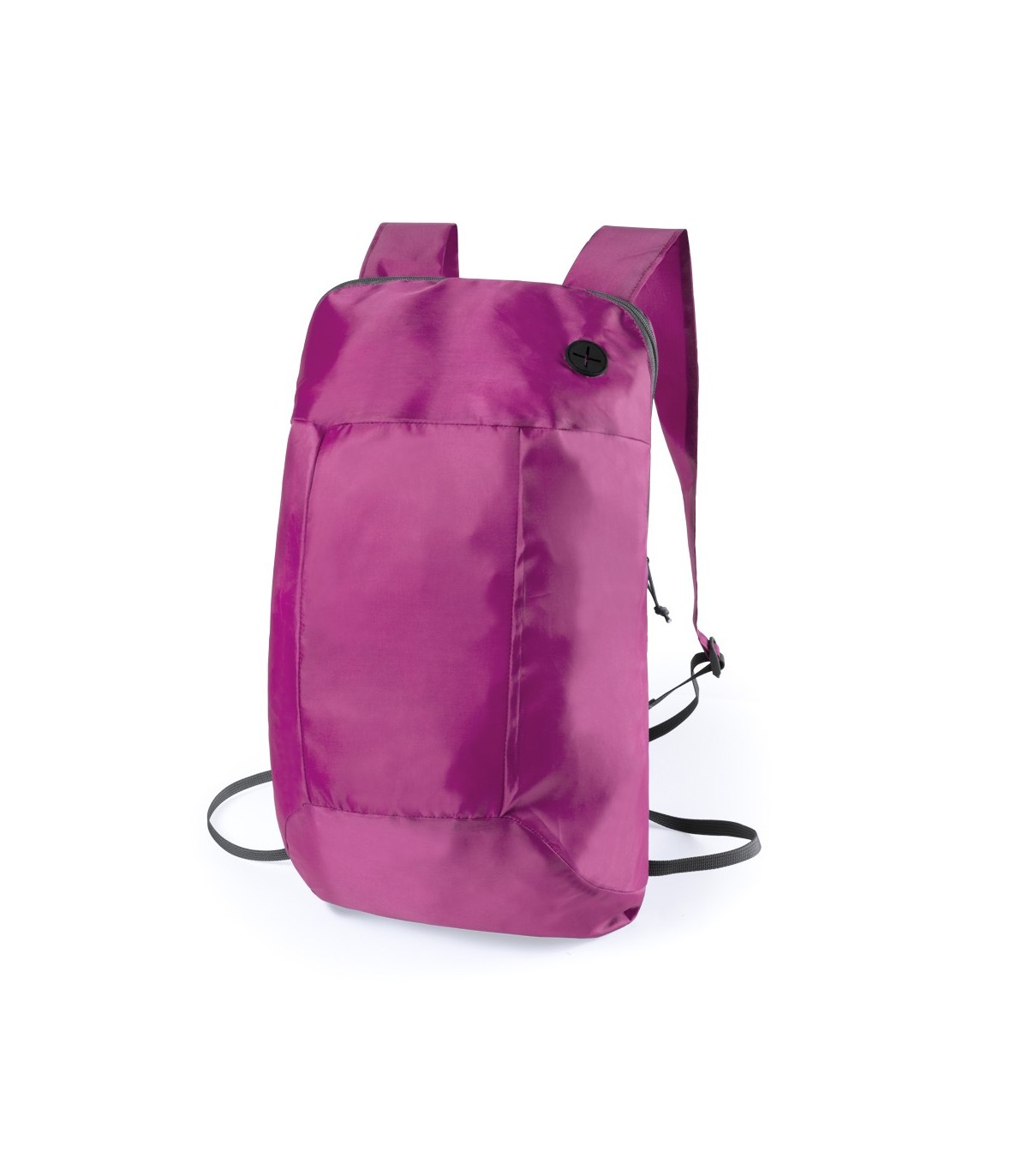 Mochila plegable en suave poliéster 210D de alegres colores, con cierre de cremallera y salida de auriculares. Con esquinas reforzadas, cintas de hombro regulables y accesorios en color negro. Plegado de pequeño tamaño.