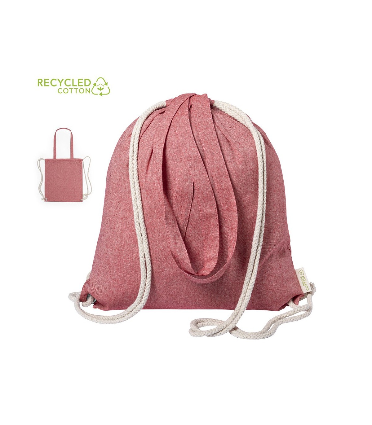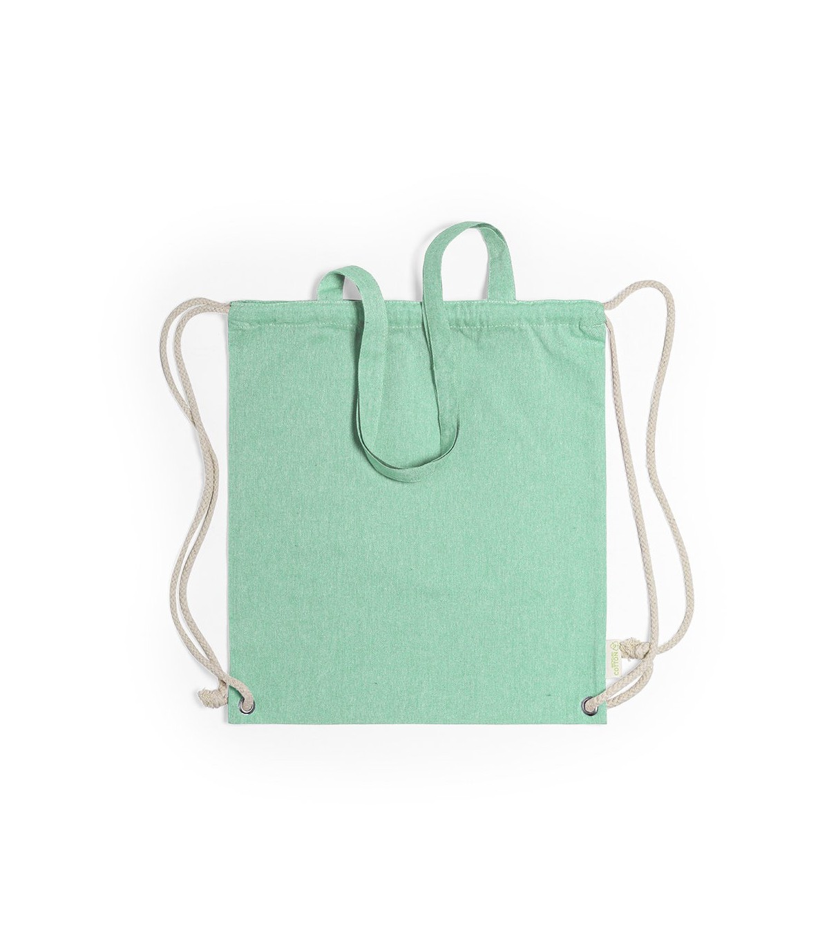 Bolsa mochila de cuerdas de línea ecológica, en resistente algodón reciclado de 140g/m2, con asas de transporte de 70 cm a juego. Cuerdas en algodón de color crudo, con argollas metálicas reforzadas y distintivo algodón reciclado en etiqueta. Disponible en variada gama de colores. Resistencia hasta 9kg de peso.