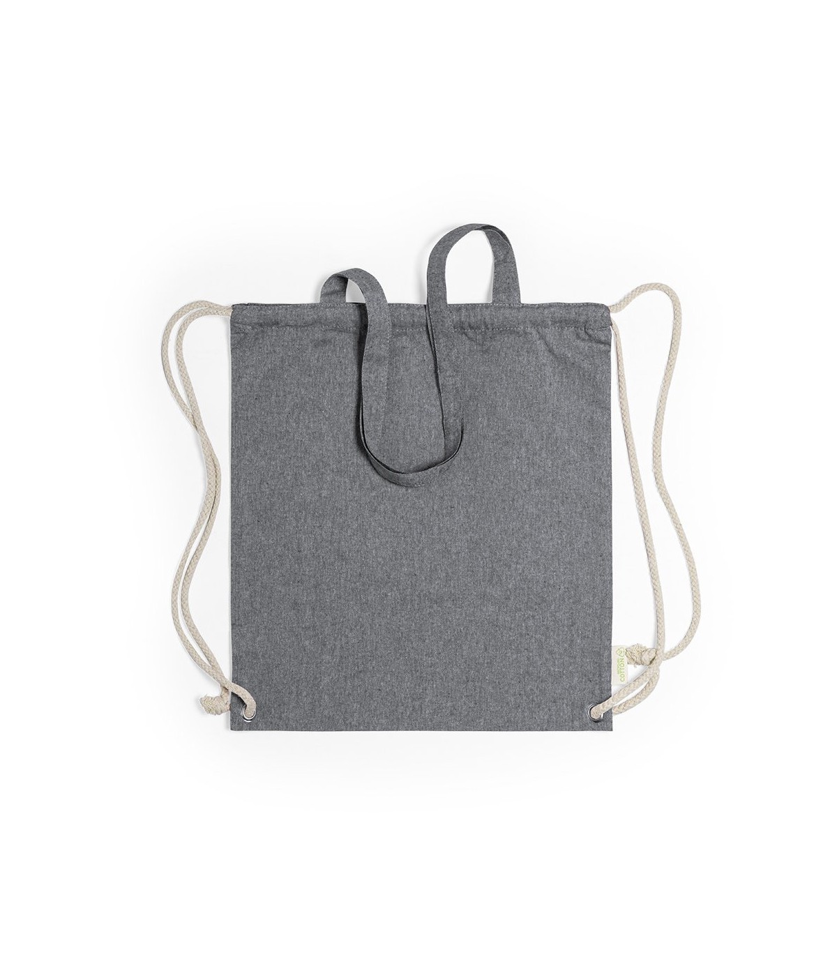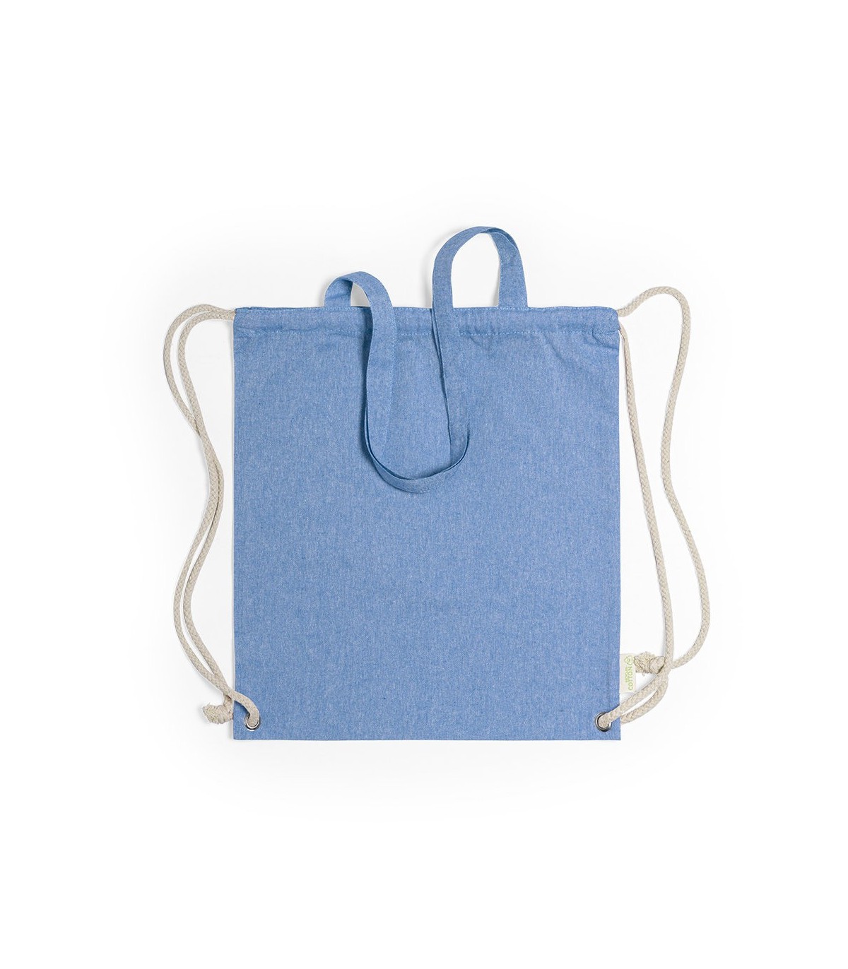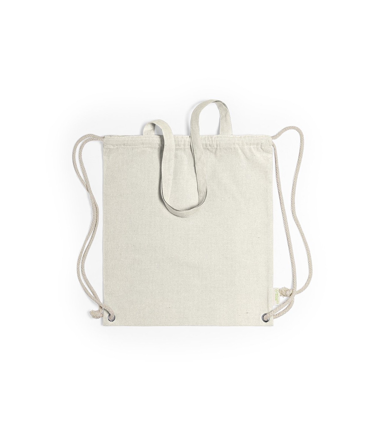 Bolsa mochila de cuerdas en algodón reciclado de 140g/m2, con asas de transporte de 70 cm a juego. Cuerdas en algodón de color crudo, con argollas metálicas reforzadas y distintivo algodón reciclado en etiqueta.