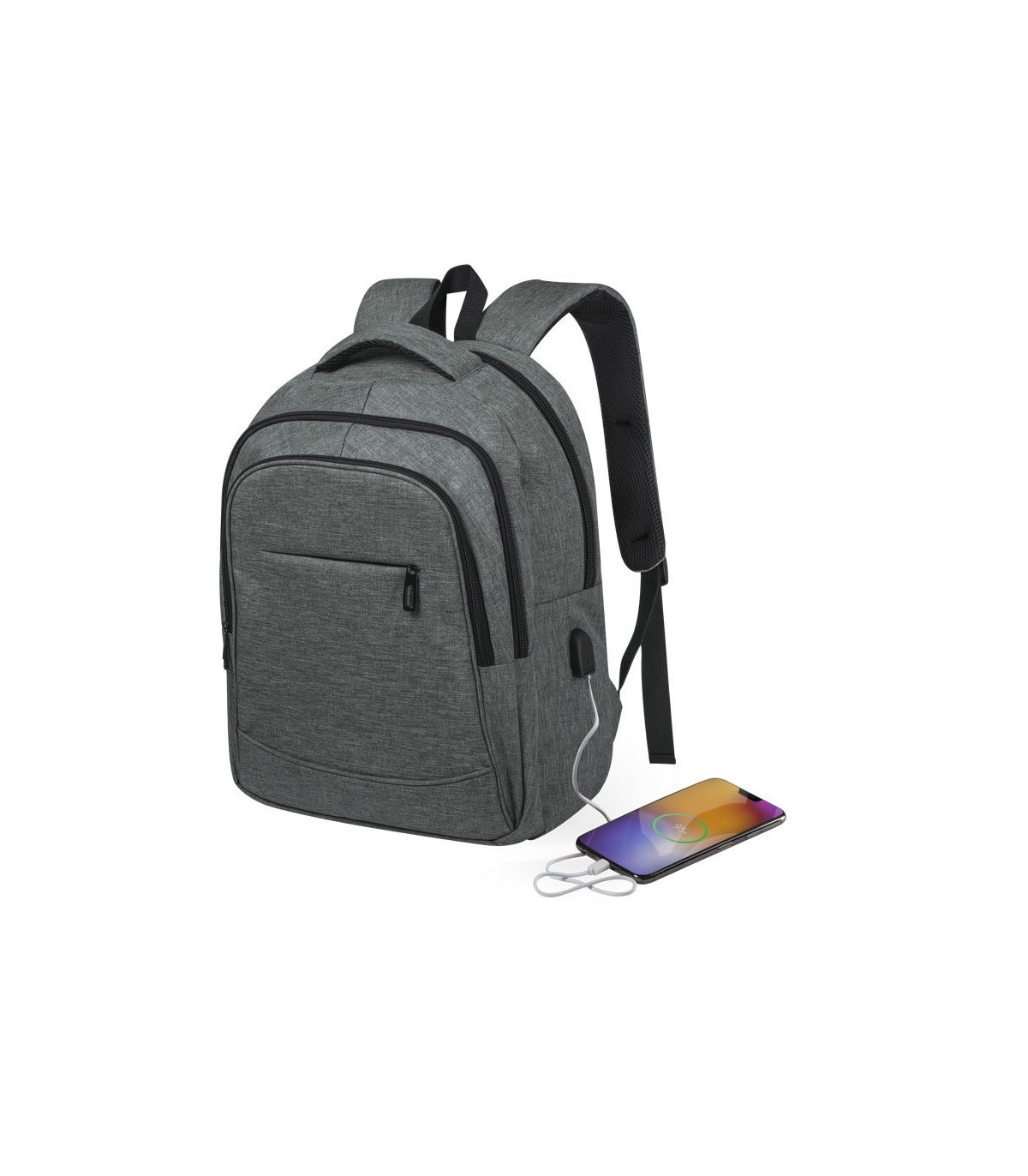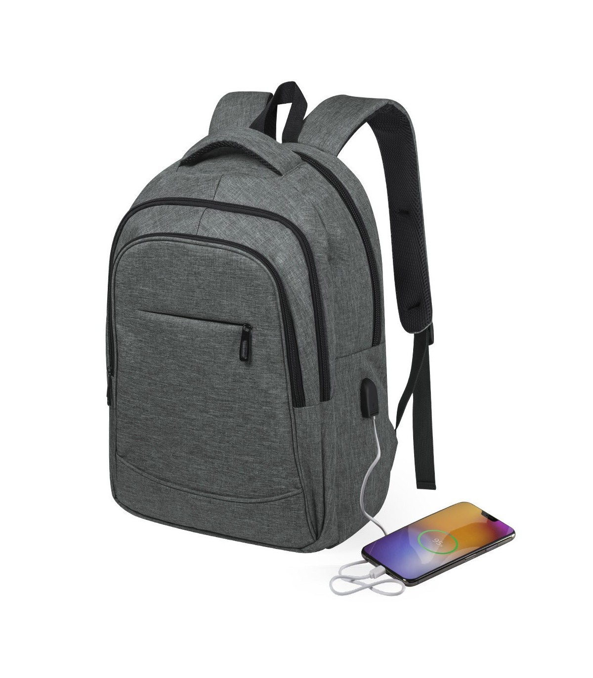 Mochila de negocios en resistente poliéster 600D. Con cierre de cremallera de doble tirador y multitud de bolsillos. Interior con bolsillos acolchados para tablet de hasta 12 pulgadas y ordenador portátil de hasta 15 pulgadas, con estación de carga USB (cable incluido, batería auxiliar no incluida). Bolsillo lateral de redecilla, esquinas reforzadas, asa de transporte acolchada y accesorios en color negro. Espalda ergonómica y cintas de hombros acolchadas y ajustables.