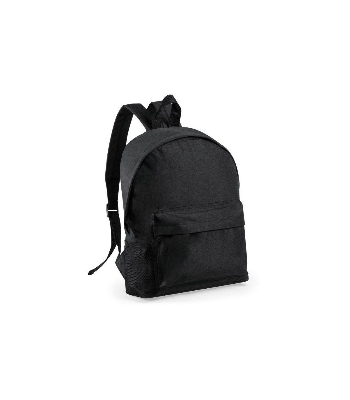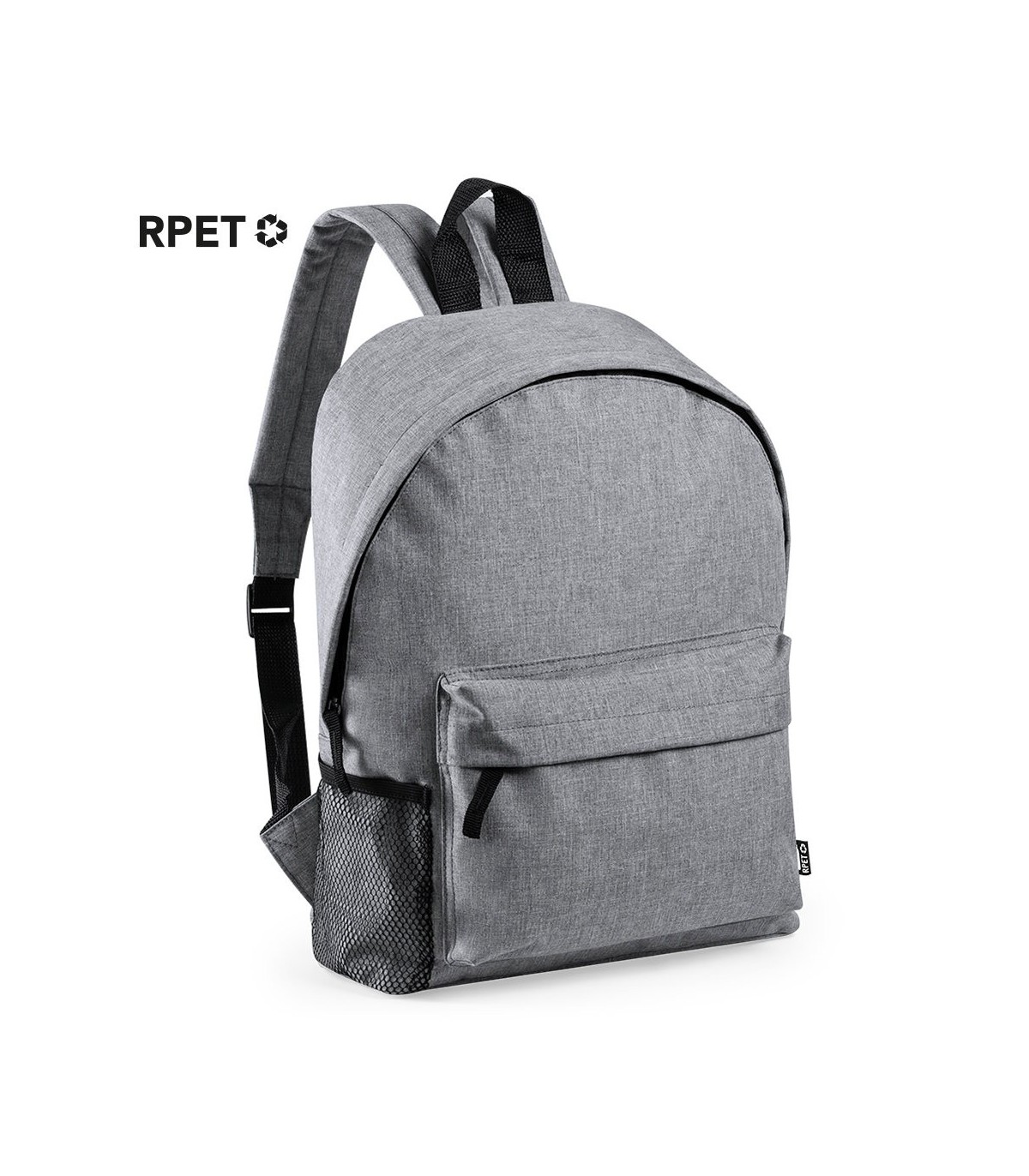 Mochila en resistente 600D RPET, elaborado a partir de plástico reciclado, para así fomentar la reutilización de residuos plásticos y ayudar a la sostenibilidad del planeta. Con cierre de cremallera y bolsillo en frontal, esquinas reforzadas, tiradores con cinta para fácil apertura y accesorios en color negro. Espalda y cintas de hombros acolchadas y ajustables. Distintivo RPET en etiqueta,