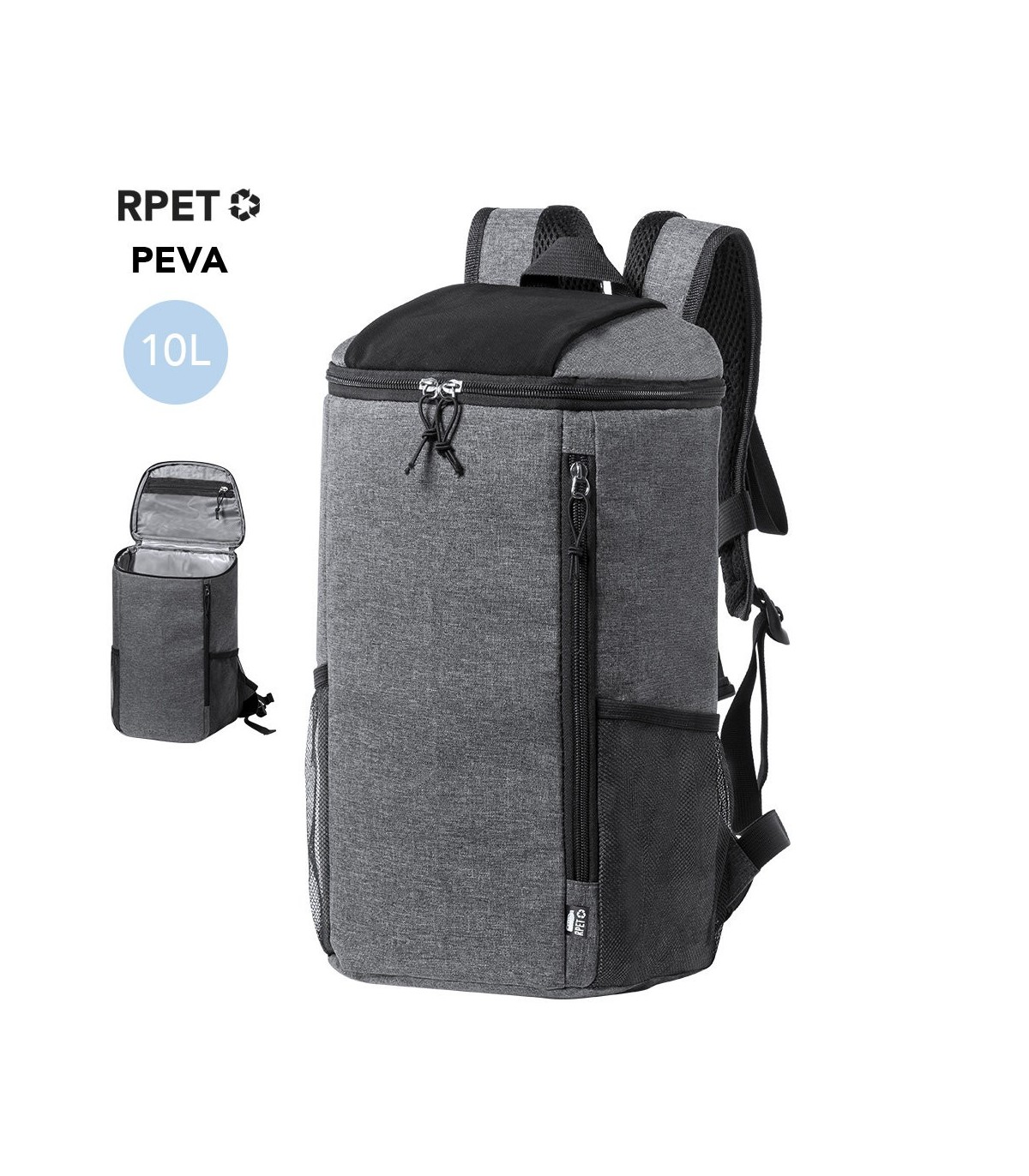 Mochila nevera 10L de fabricación ecológica, hecho en resistente poliéster RPET 600D de alta calidad, elaborado a partir de plástico reciclado para promover su reutilización y así disminuir la emisión de agentes contaminantes en nuestro planeta. Compartimento principal con cierre de cremallera de doble tirador, con interior en PEVA. Con bolsillos laterales en redecilla y bolsillo frontal de acceso rápido con cierre de cremallera y tirador. Banda elástica en la parte superior, y en bolsillo en la parte trasera.Totalmente acolchada. Distintivo RPET en etiqueta.