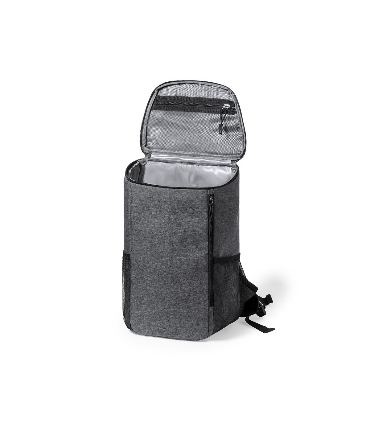 Mochila nevera 10L con compartimento principal con cierre de cremallera de doble tirador, con interior en PEVA. Con bolsillos laterales en redecilla y bolsillo frontal de acceso rápido.