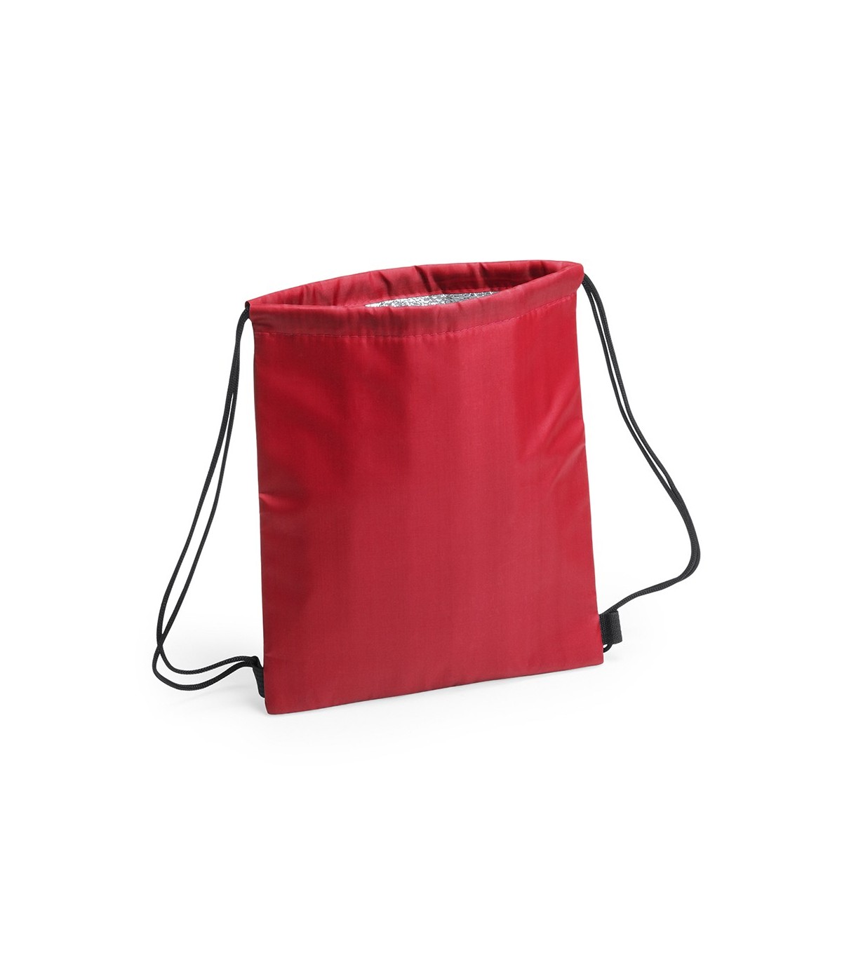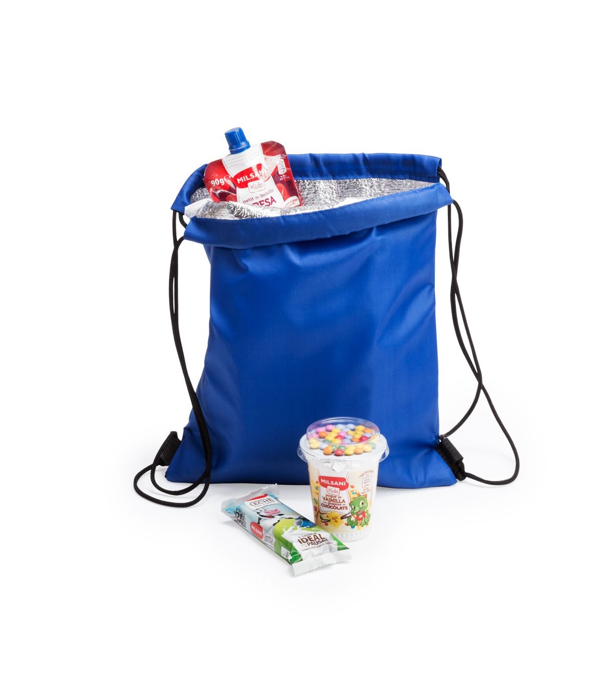 Mochilas para comida personalizadas con tu logo de empresa para regalos de merchandising publicitarias fabricadas en poliéster y aluminio con asas de cordón.
