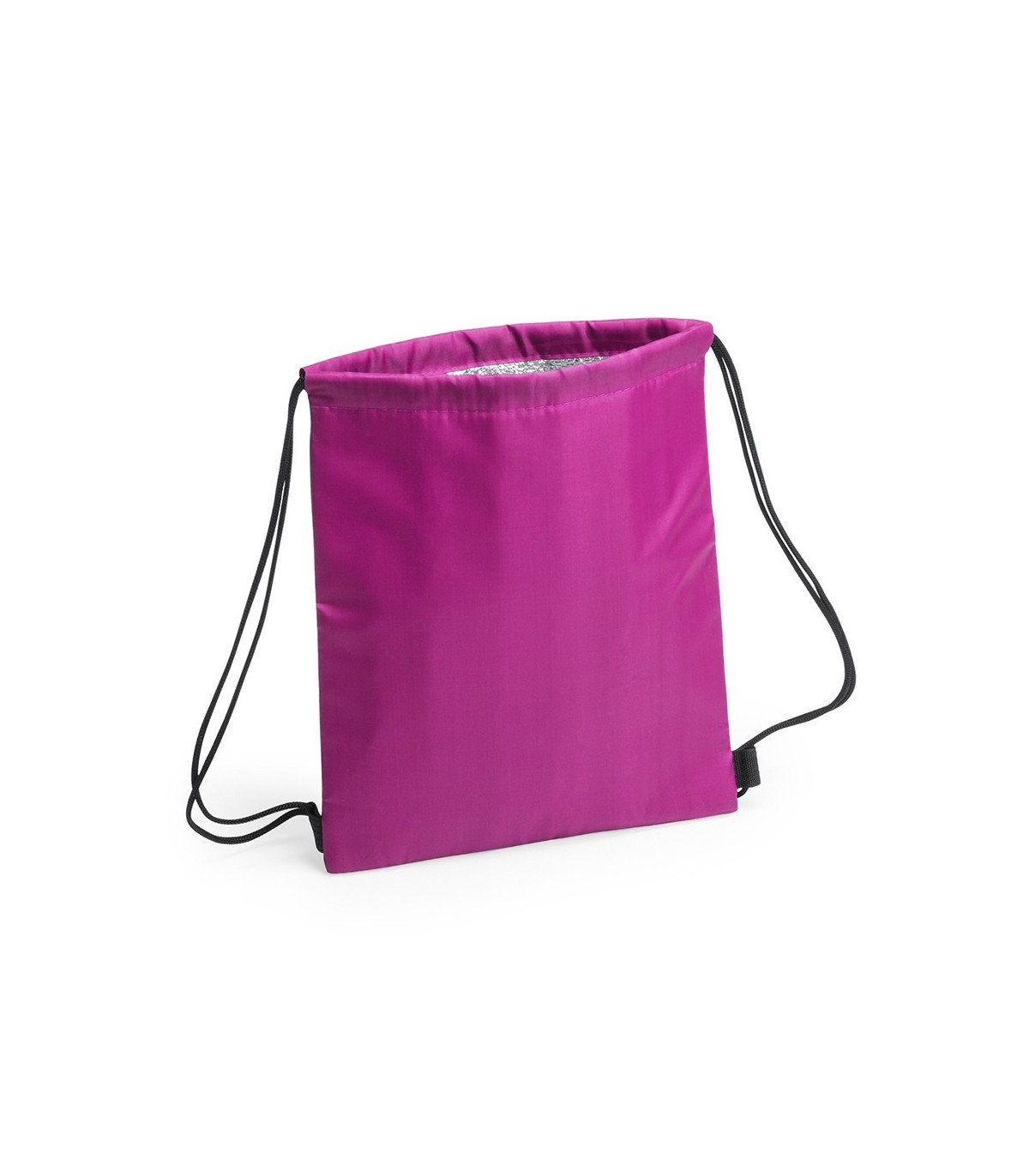 Mochila nevera de cuerdas para niño en suave poliéster 210D de alegres colores y extensa gama de colores. Con cuerdas autocierre en color negro y esquinas con refuerzo. Interior isotermo en acabado de aluminio.