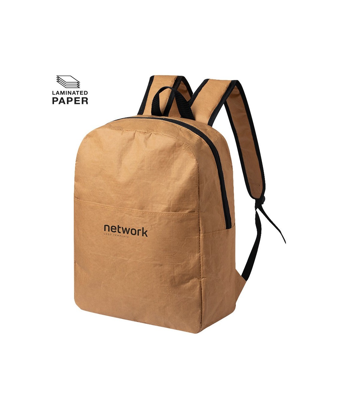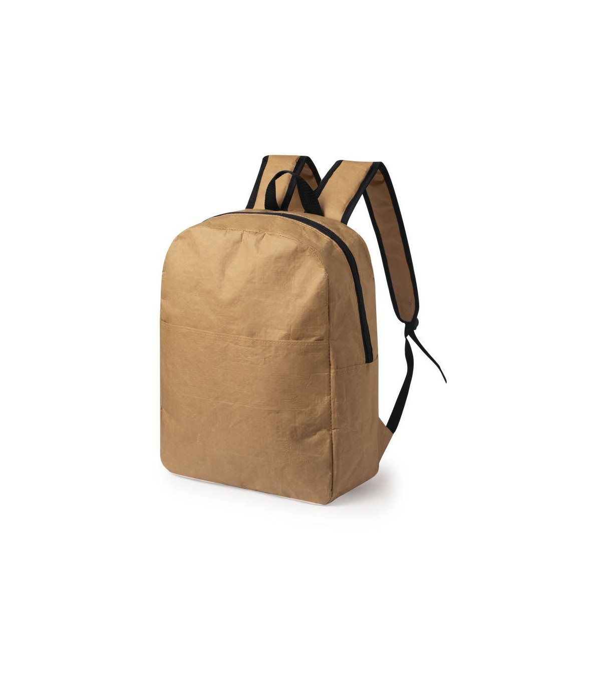 Innovadora mochila en papel laminado ultra resistente de 130 g/m2, resistente a las salpicaduras de agua. Con cierre de cremallera, bolsillo en frontal y bolsillo lateral de gran capacidad. Asa de transporte y accesorios en color negro, con cintas de hombros acolchadas y ajustables.