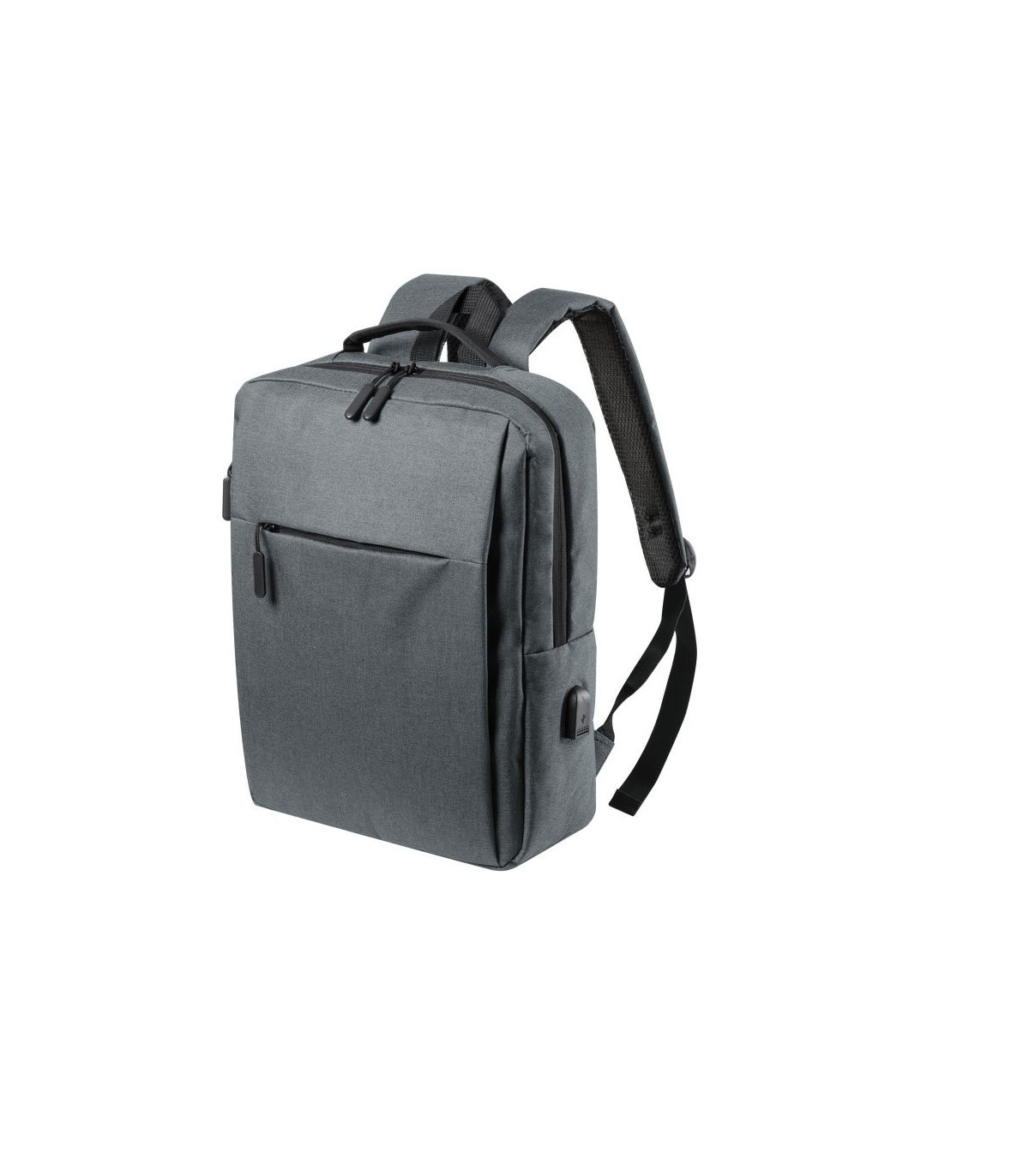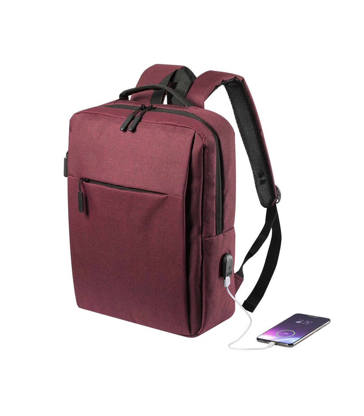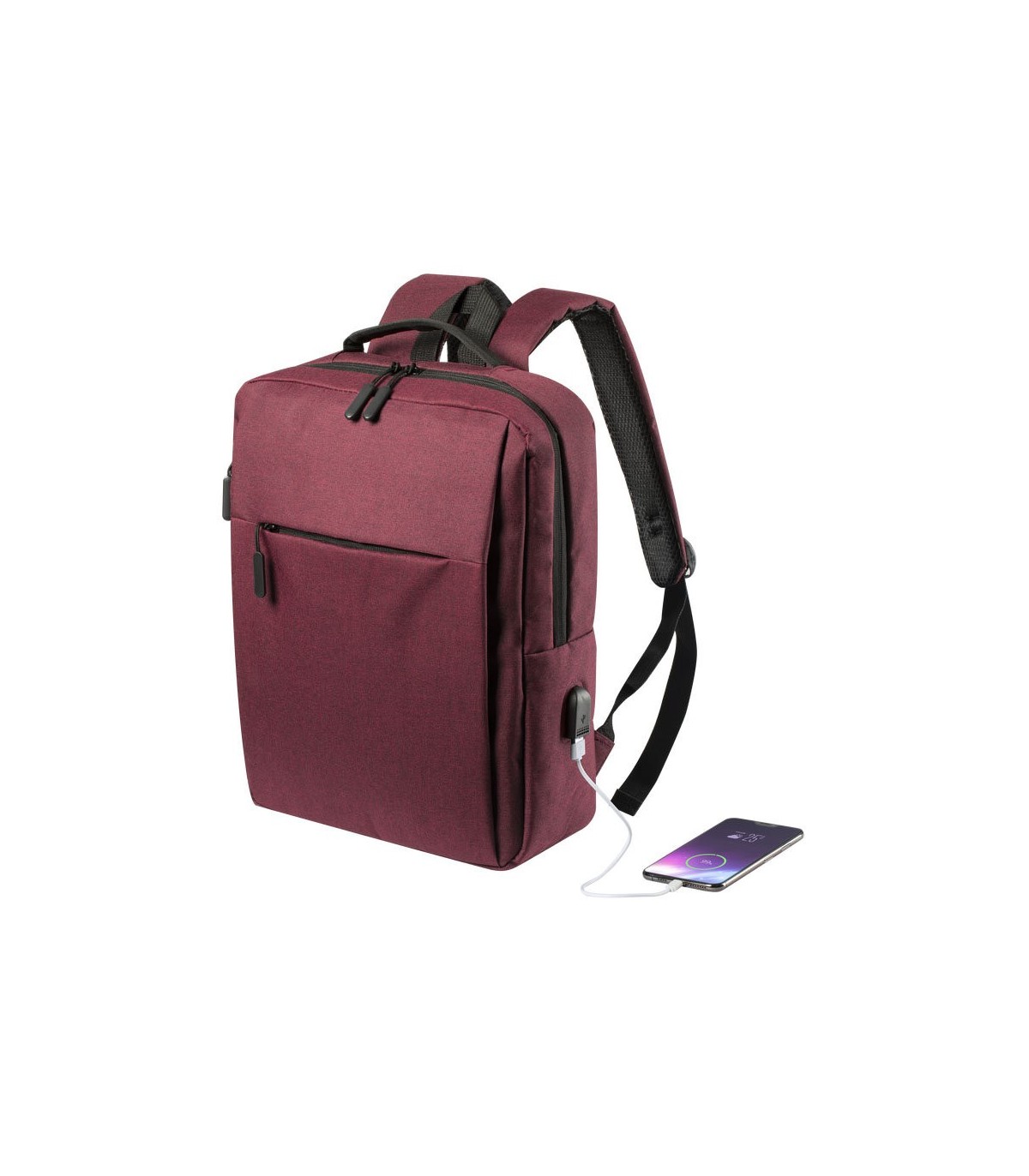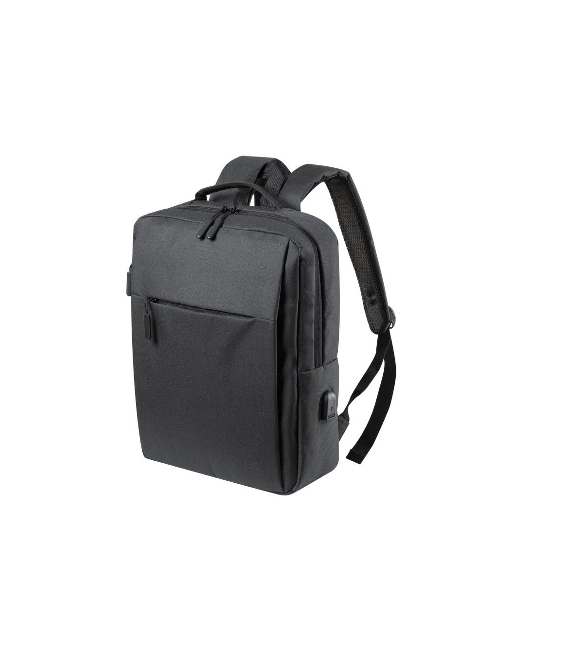 Mochila de negocios en resistente poliéster 600D. Con cierre de cremallera de doble tirador y multitud de bolsillos. Interior con bolsillo acolchado para ordenador portátil de hasta 15 pulgadas. Compartimento interior con salida USB para conexión de powerbank -no incluido-. Esquinas reforzadas, asa de transporte acolchada y accesorios en color negro. Espalda y cintas de hombros acolchadas y ajustables. Disponible en sobria gama de colores.