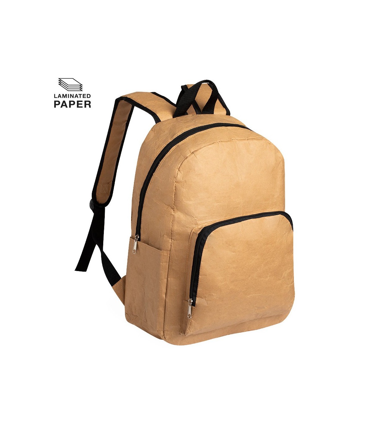 Innovadora mochila en papel laminado ultra resistente de 130 g/m2, resistente a las salpicaduras de agua. Compartimento principal y amplio bolsillo en frontal con cierres de cremallera. Asa de transporte y accesorios en color negro, con cintas de hombros acolchadas y ajustables.