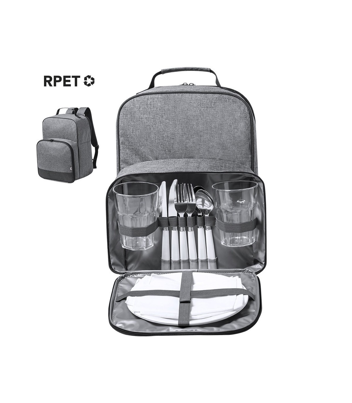 Mochila nevera para picnic de línea nature, fabricada en resistente RPET 600D de alta calidad, elaborado a partir de plástico reciclado para así fomentar la reutilización de residuos plásticos y contribuir a la sostenibilidad del planeta. Ideal para 2 personas, con bolsillo independiente para un almacenaje seguro. Incluye 2 vasos, 2 cuchillos, 2 cucharas, 2 tenedores, 2 platos y 2 servilletas. Compartimento nevera con interior en PEVA y cómoda asa de transporte. Cintas y parte trasera acolchadas. Distintivo RPET en etiqueta.