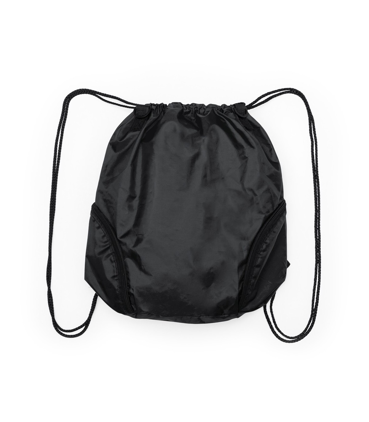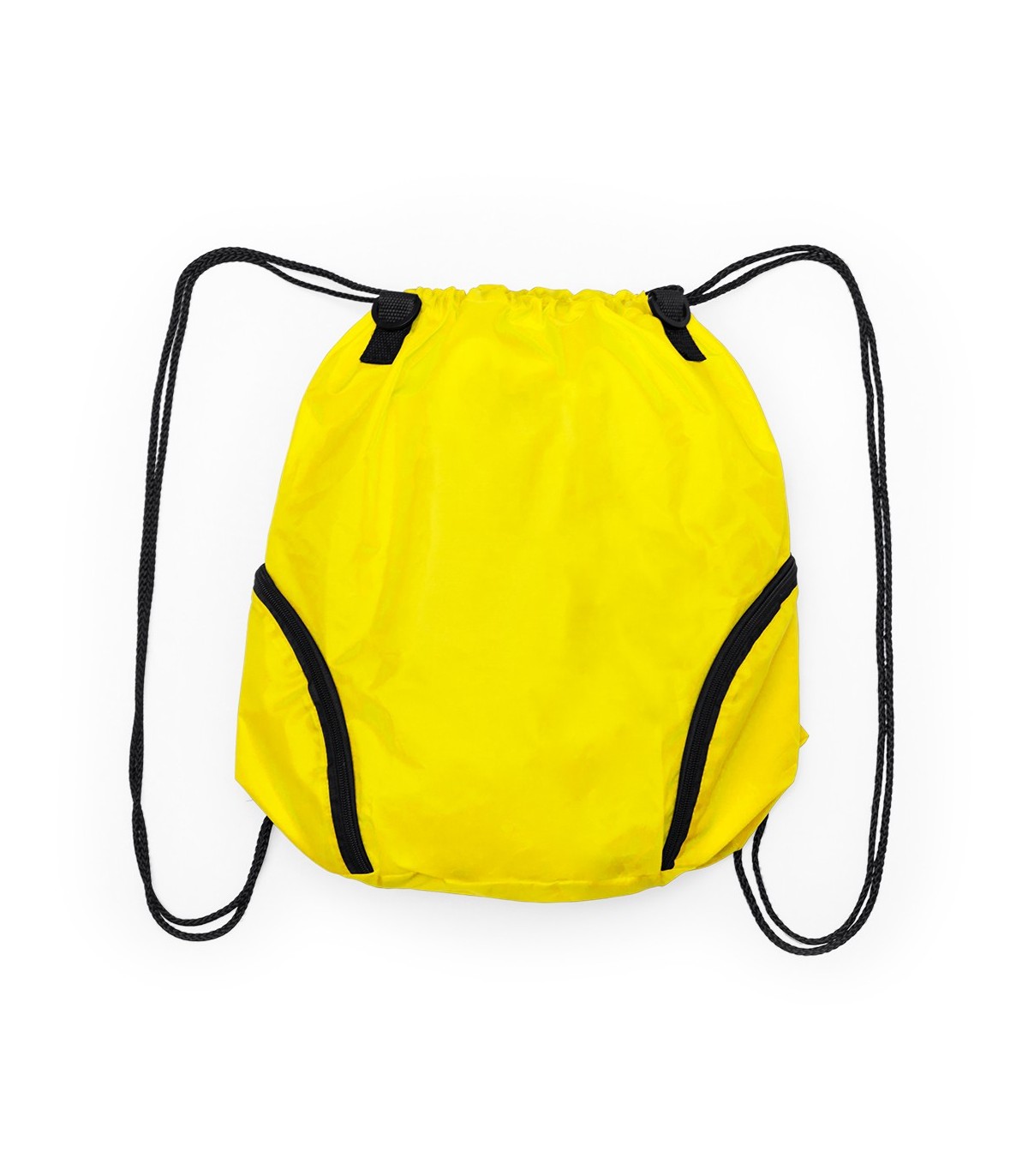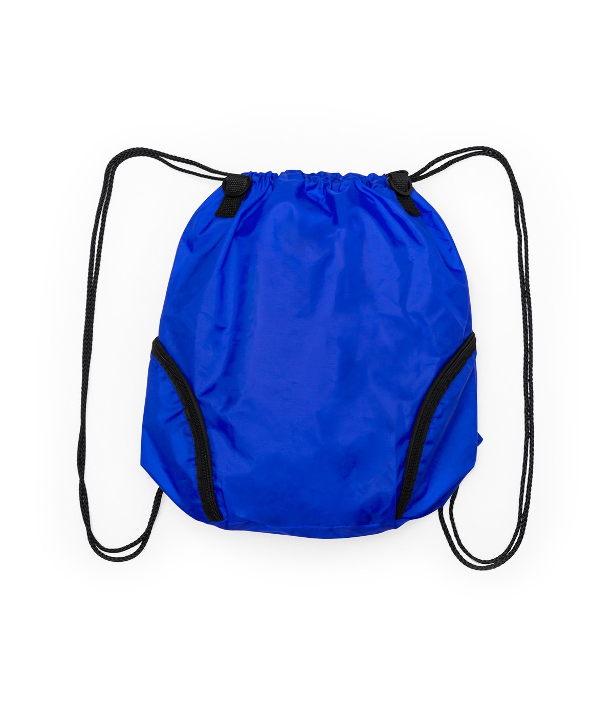 Versátil mochila de cuerdas en poliéster 210D en atractivo diseño bicolor. Con 3 bolsillos exteriores de cremallera y accesorio en cierre para acople de asa de transporte con cierres de mosquetón. Cuerdas autocierre en color negro y esquinas con argollas metálicas reforzadas.