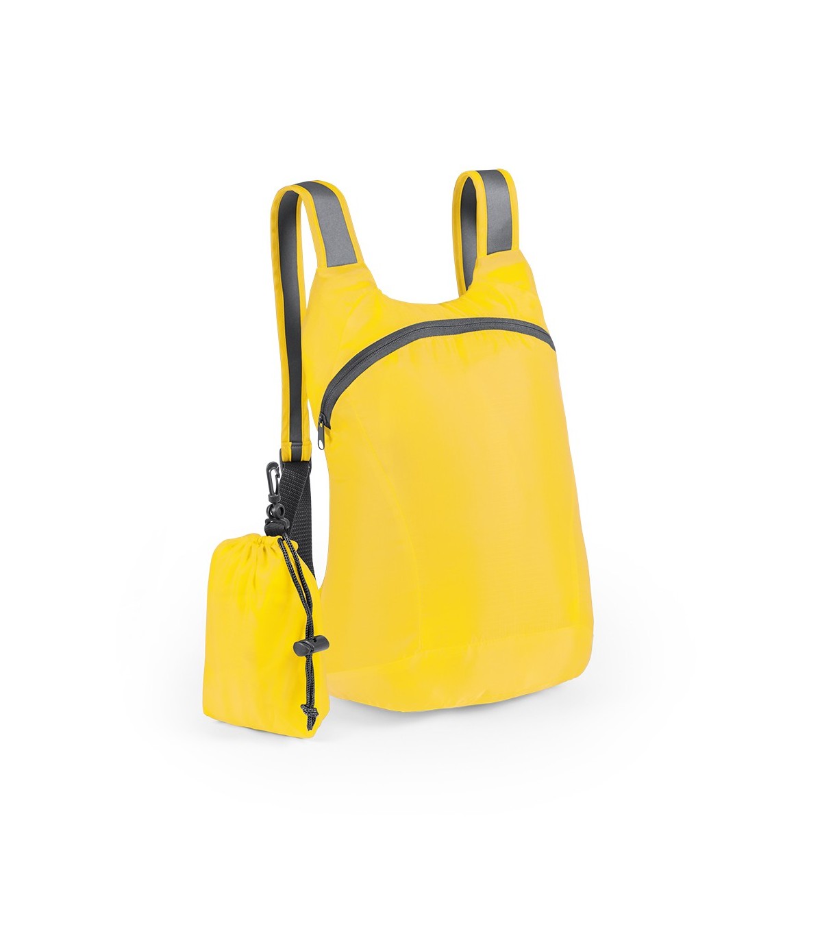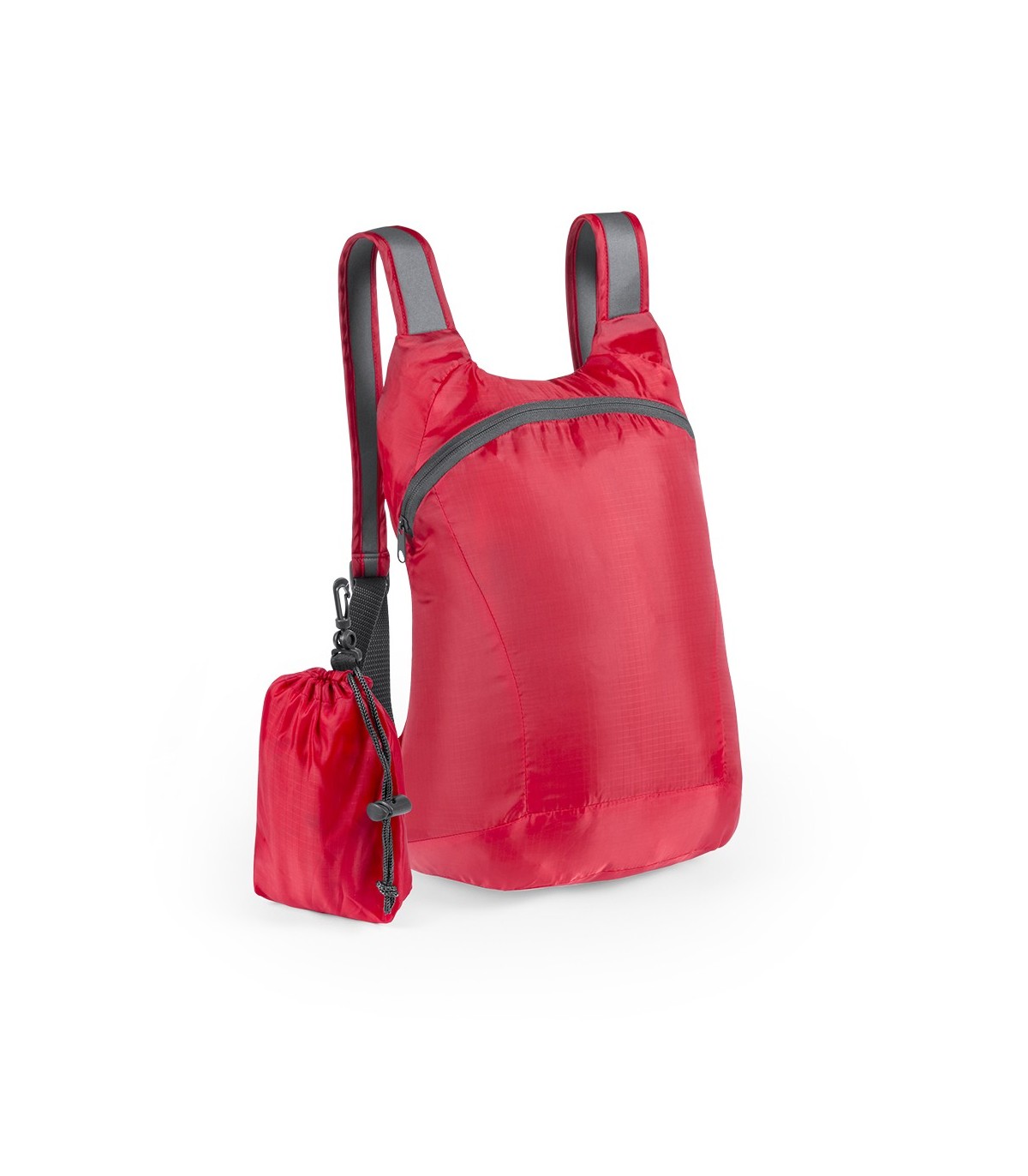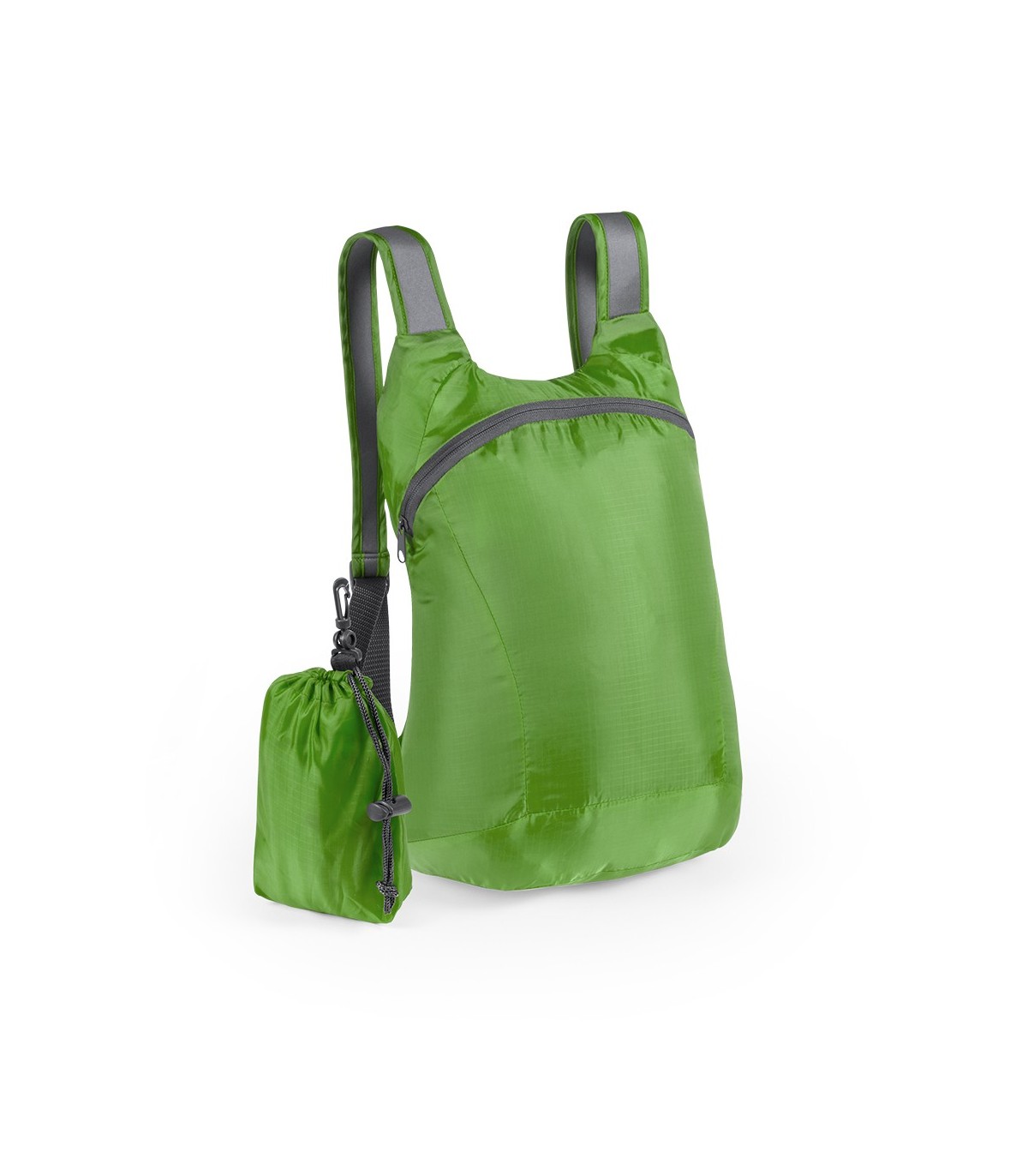 Mochila plegable en suave y resistente material ripstop. Cierre de cremallera, accesorios en color gris y cintas de hombros regulables. Plegado de tamaño compacto, con cinta y mosquetón de transporte. Disponible en variada gama de colores.