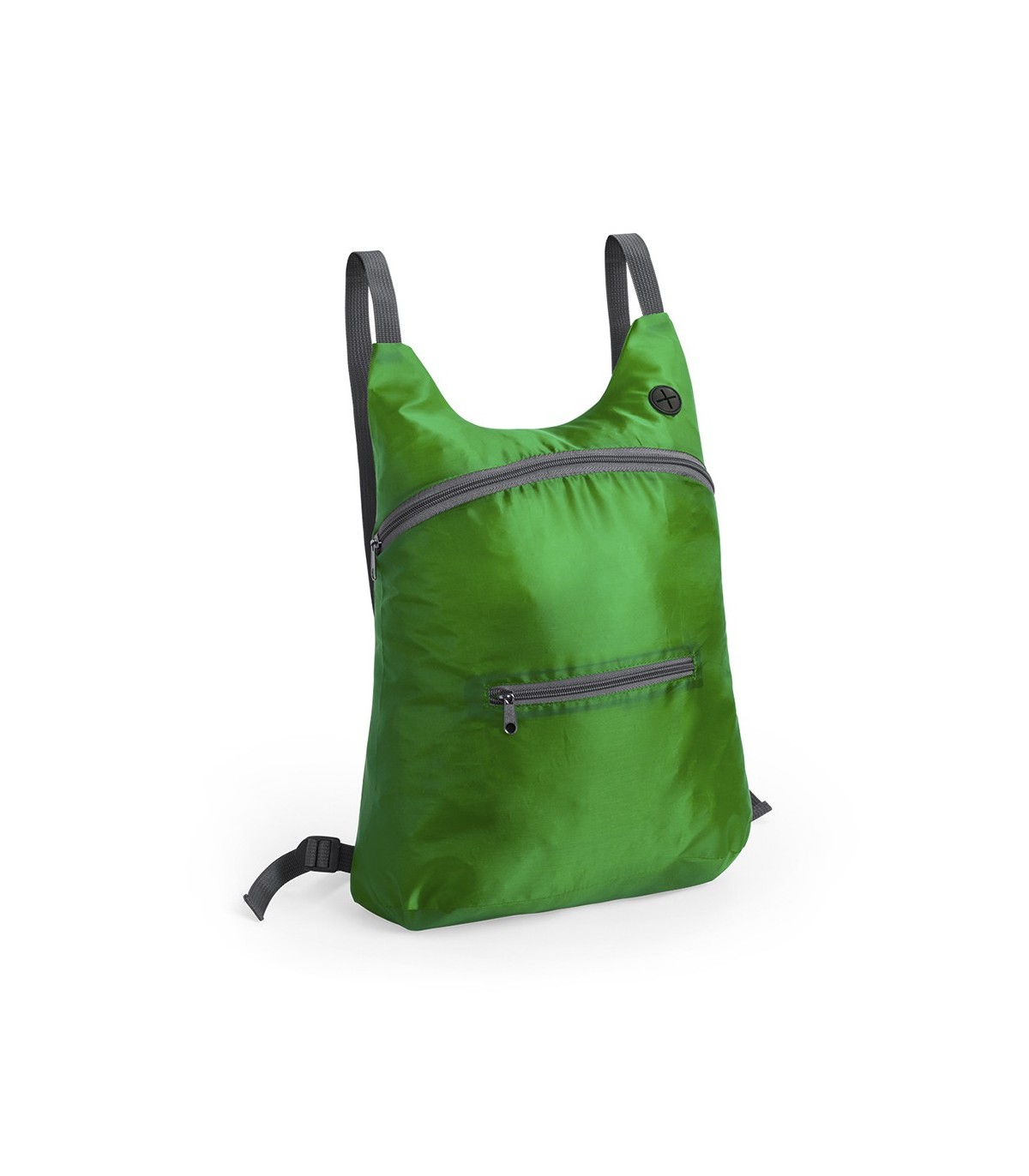 Mochila plegable en suave poliéster 201D de alegres colores, con cierre de cremallera, bolsillo frontal y salida de auriculares. Con esquinas reforzadas, cintas de hombro regulables y accesorios en color gris. Plegado de pequeño tamaño con cinta de transporte.