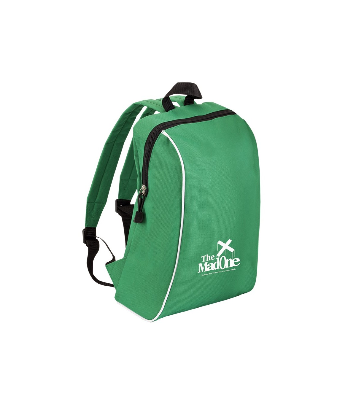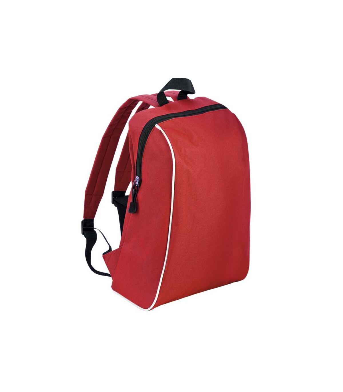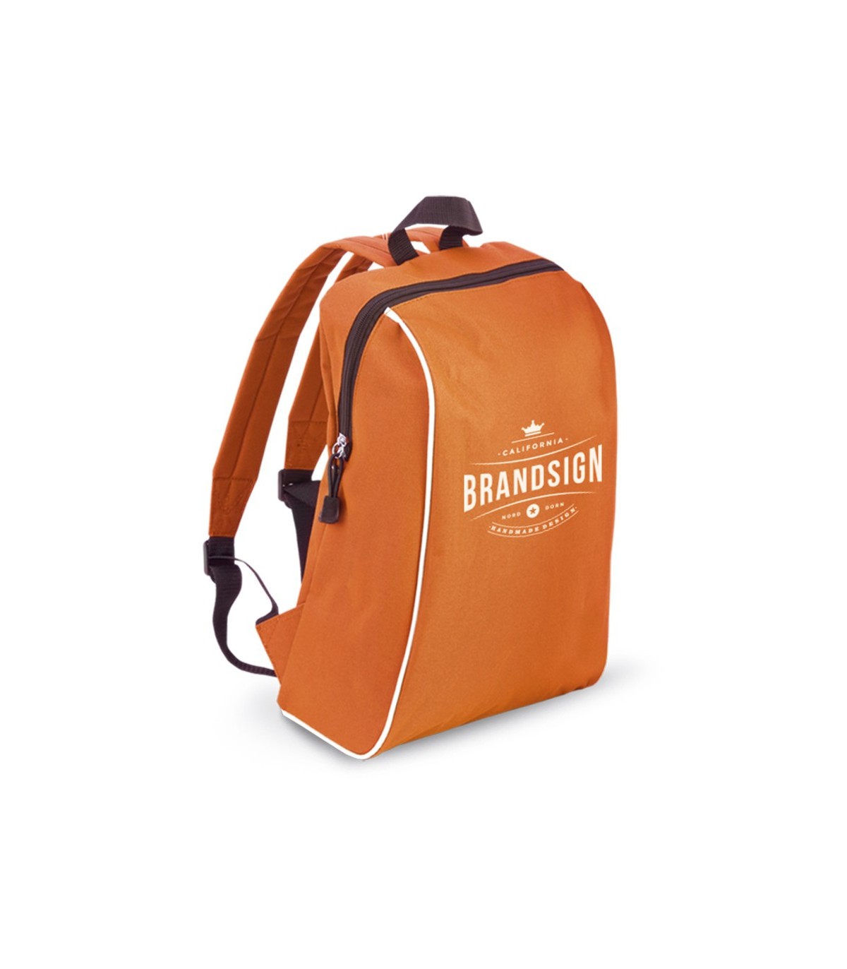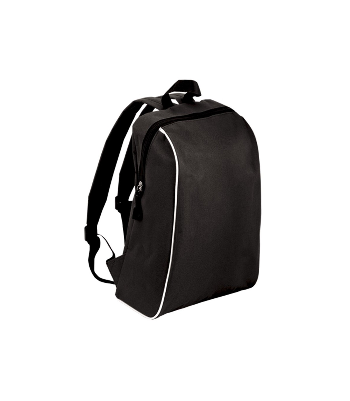 Mochila en resistente poliéster 600D de desenfadado diseño en variada gama de colores, con cierre de cremallera y ribete en color blanco. Con esquinas reforzadas y accesorios en negro. Cintas de hombros ajustables con acolchado.
