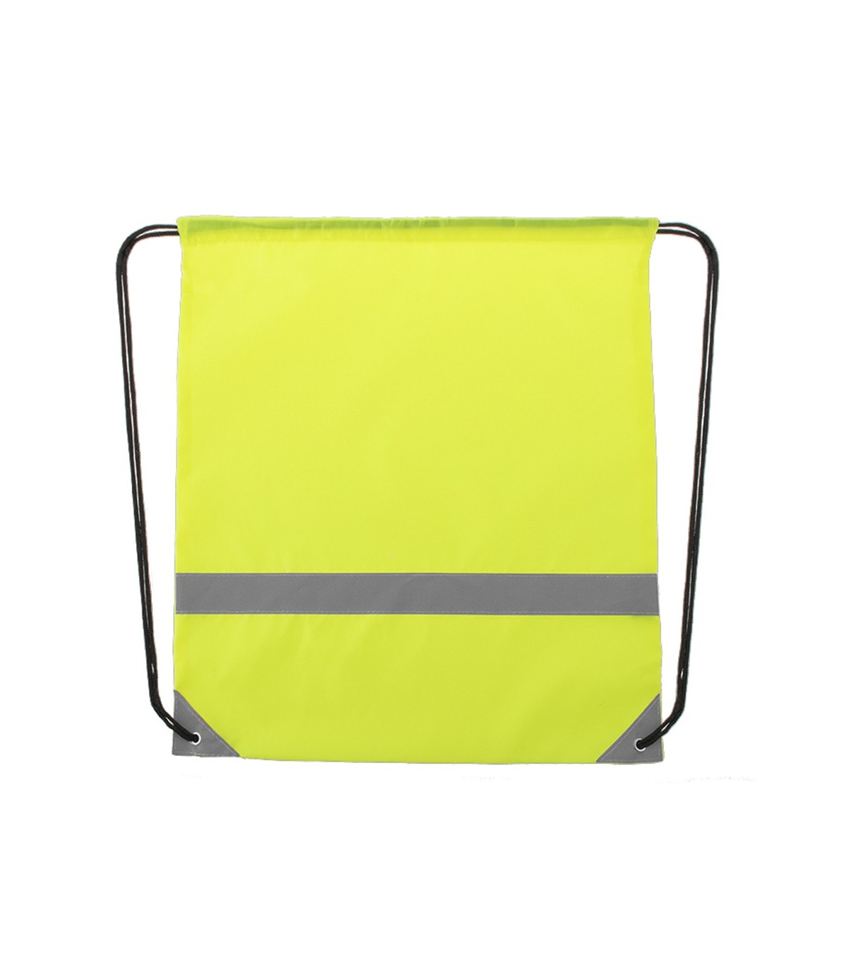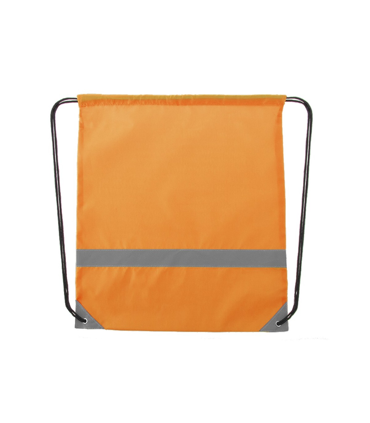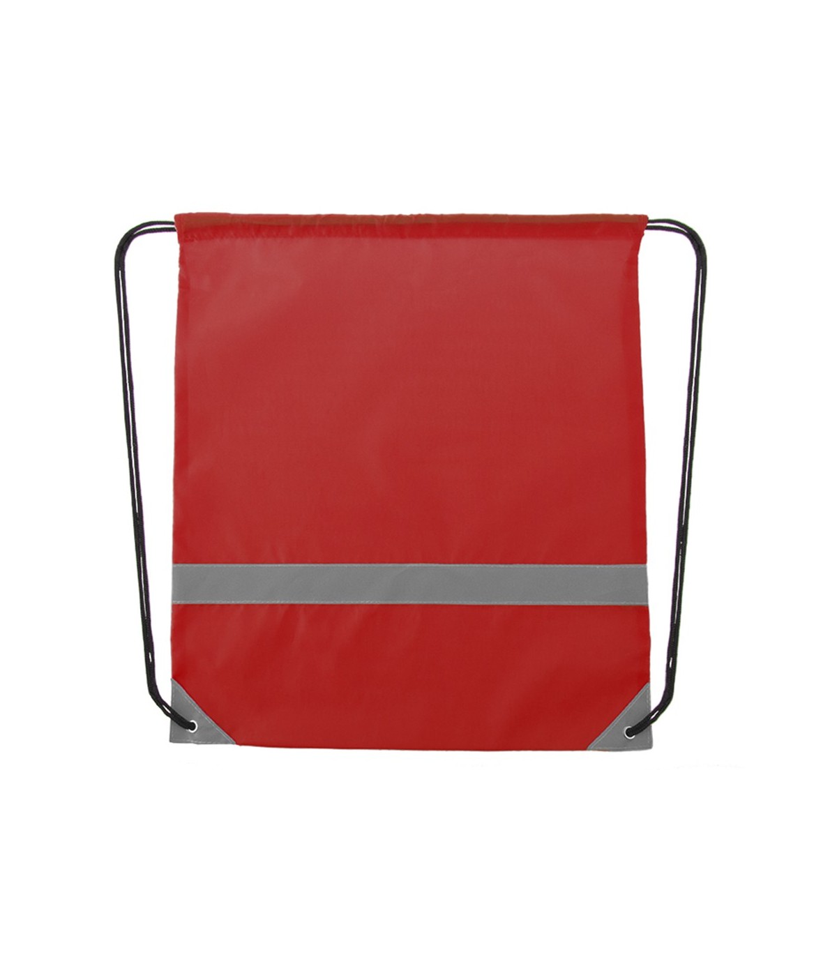 Mochila reflectante en suave poliéster 190T de alegres colores, con tira frontal reflectante. Cuerdas autocierre en color negro y esquinas reflectantes reforzadas con argollas metálicas.