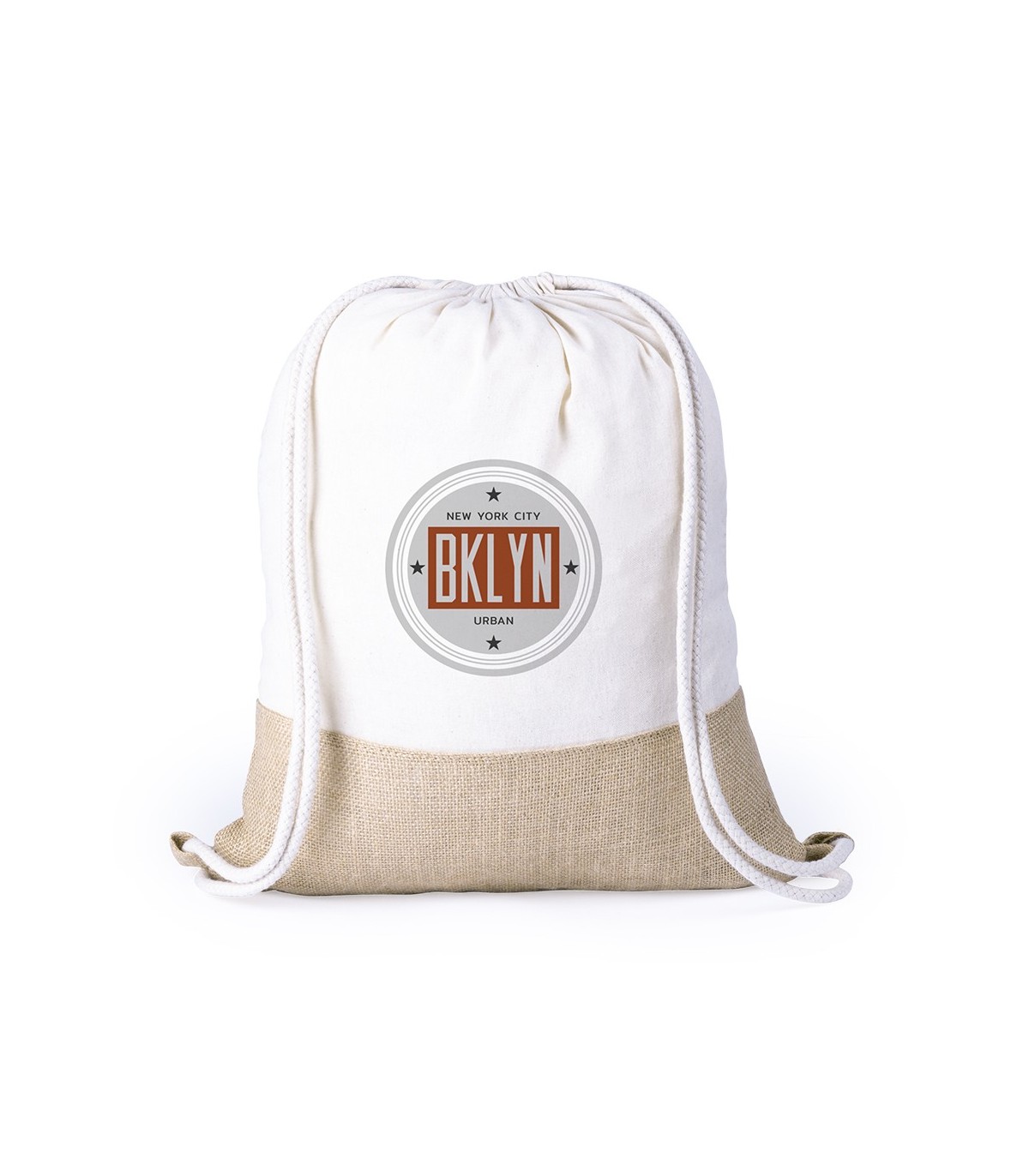 Mochila de cuerdas en línea ecológica, con base en resistente yute y parte superior en algodón de 120g/m2. Con cuerdas trenzadas gruesas y esquinas reforzadas.