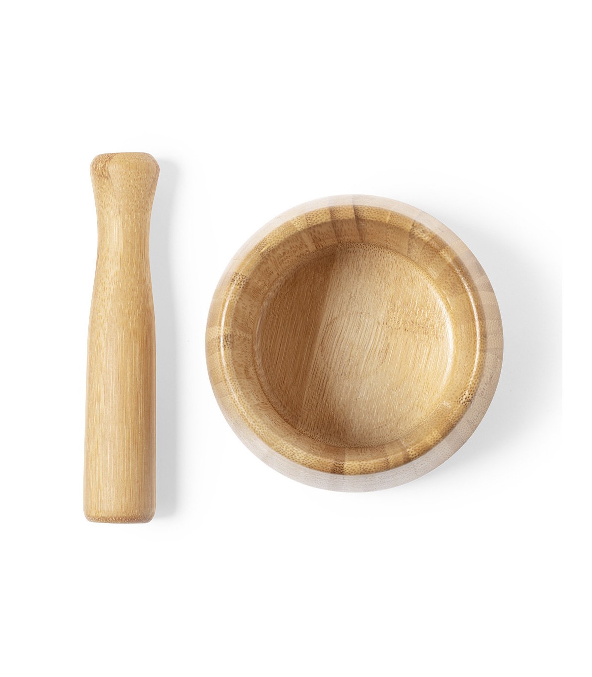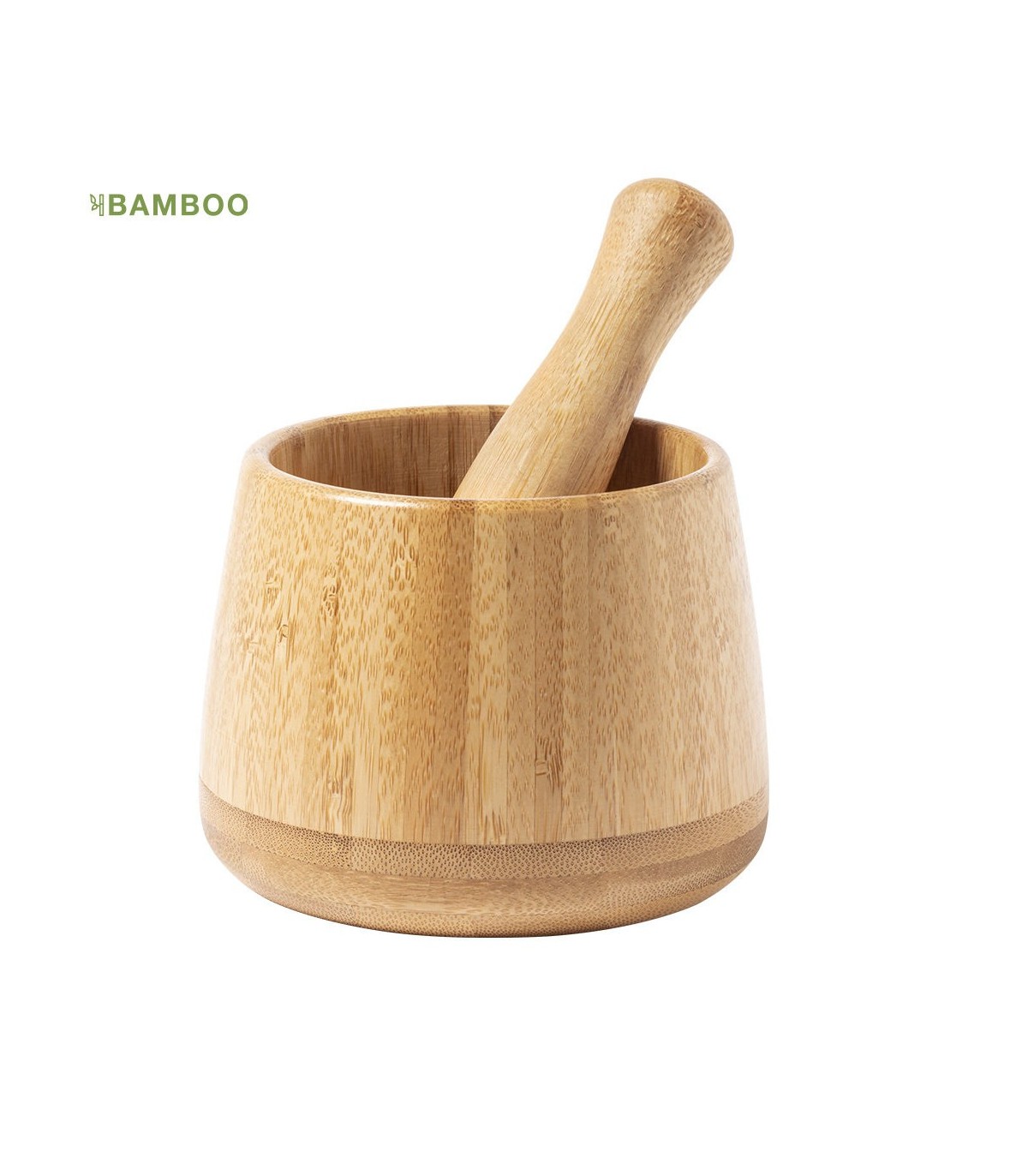 Morteros ecológicos personalizados. Fabricado en bambú, para así fomentar el uso de materias primas naturales. Con macerador incluido.