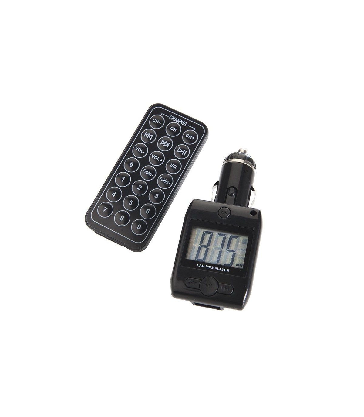 Reproductor de música MP3 para mechero de coche. Conexión a la radio del automóvil vía frecuencia FM. Pantalla LCD integrada, ranura para tarjeta SD y conexión de datos USB. Con mando a distancia multifunción y sistema de ajuste telescópico. Presentado en atractiva caja de diseño.