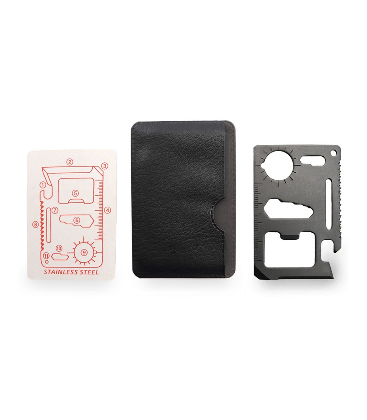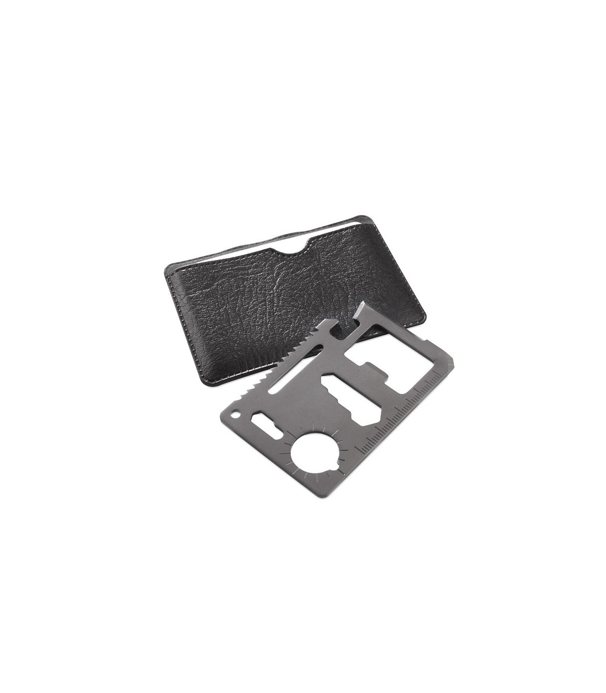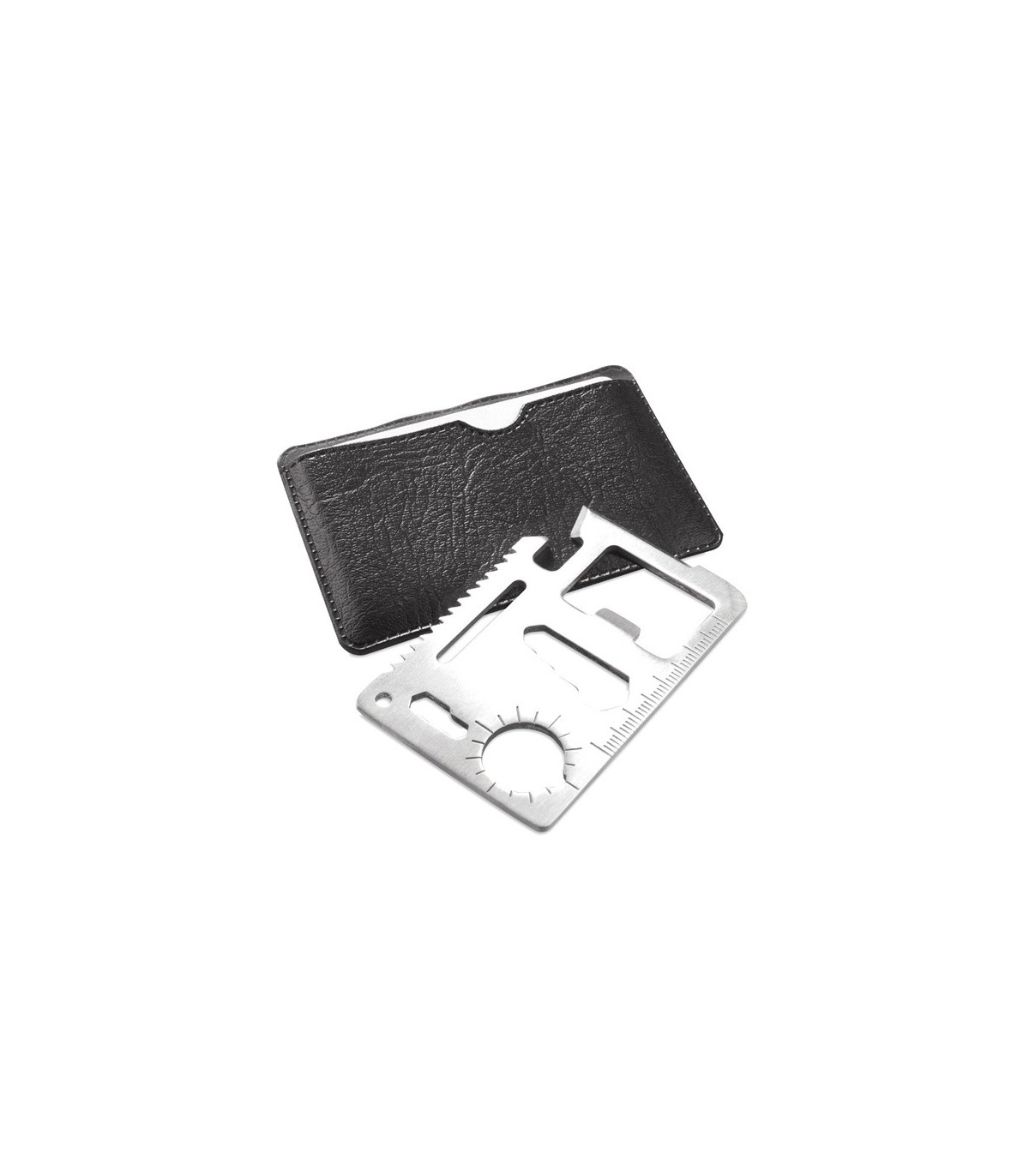Multiherramienta con resistente cuerpo en acero inox con 11 funciones. Con funciones abrelatas, cuchillo, destornillador, regla, abrebotellas, llaves inglesas, llaves de mariposas, sierra e indicador de dirección. Presentada en resistente funda de polipiel.